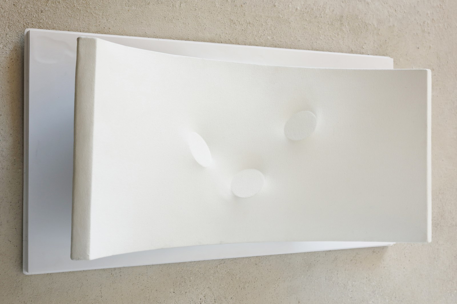 SIMETI TURI (n. 1929) 3 ovali bianchi. 1999. Acrilico su tela sagomata. Cm 64,00 x 30,00 x 14,00. Al retro firma e dedica. Opera archiviata presso l'Archivio Turi Simeti, Milano come da documentazione fotografica allegata all'opera riportante il relativo numero d'inventario e la firma dell'artista. Provenienza: Fabiani Arte, Montecatini. Pubblicazione: Catalogo Generale Turi Simeti a cura di Addamiano Antonio e Scardella Federico, Skira edizioni, 2017 Volume II, tav.730. Entro teca di plexiglass. Cornice presente