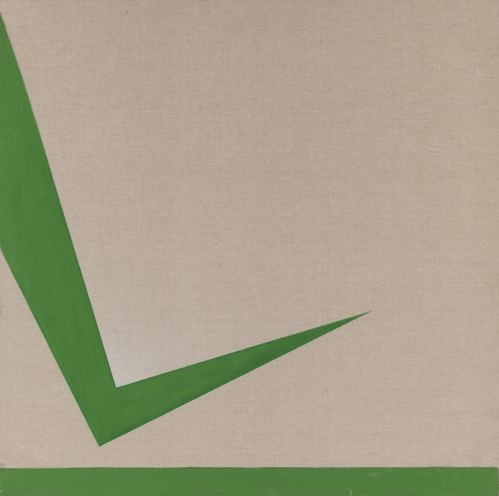 HIROMI MASUDA (n. 1942) Un po' di verde. 1980. Tecnica mista su tela. Cm 100,00 x 100,00. Al retro titolo, firma, anno e cartiglio descrittivo con timbro dell'artista.