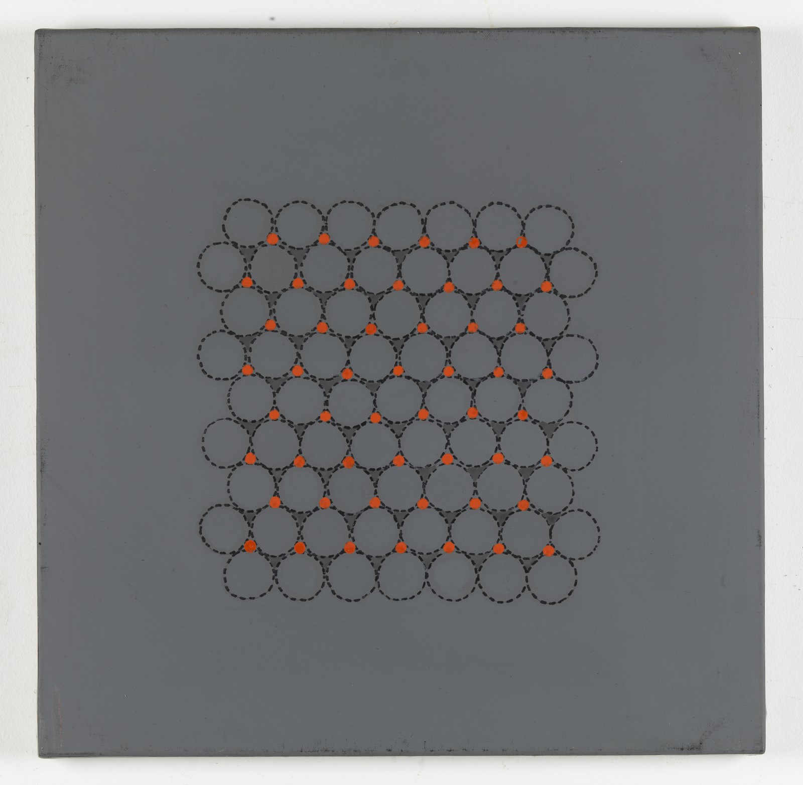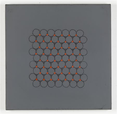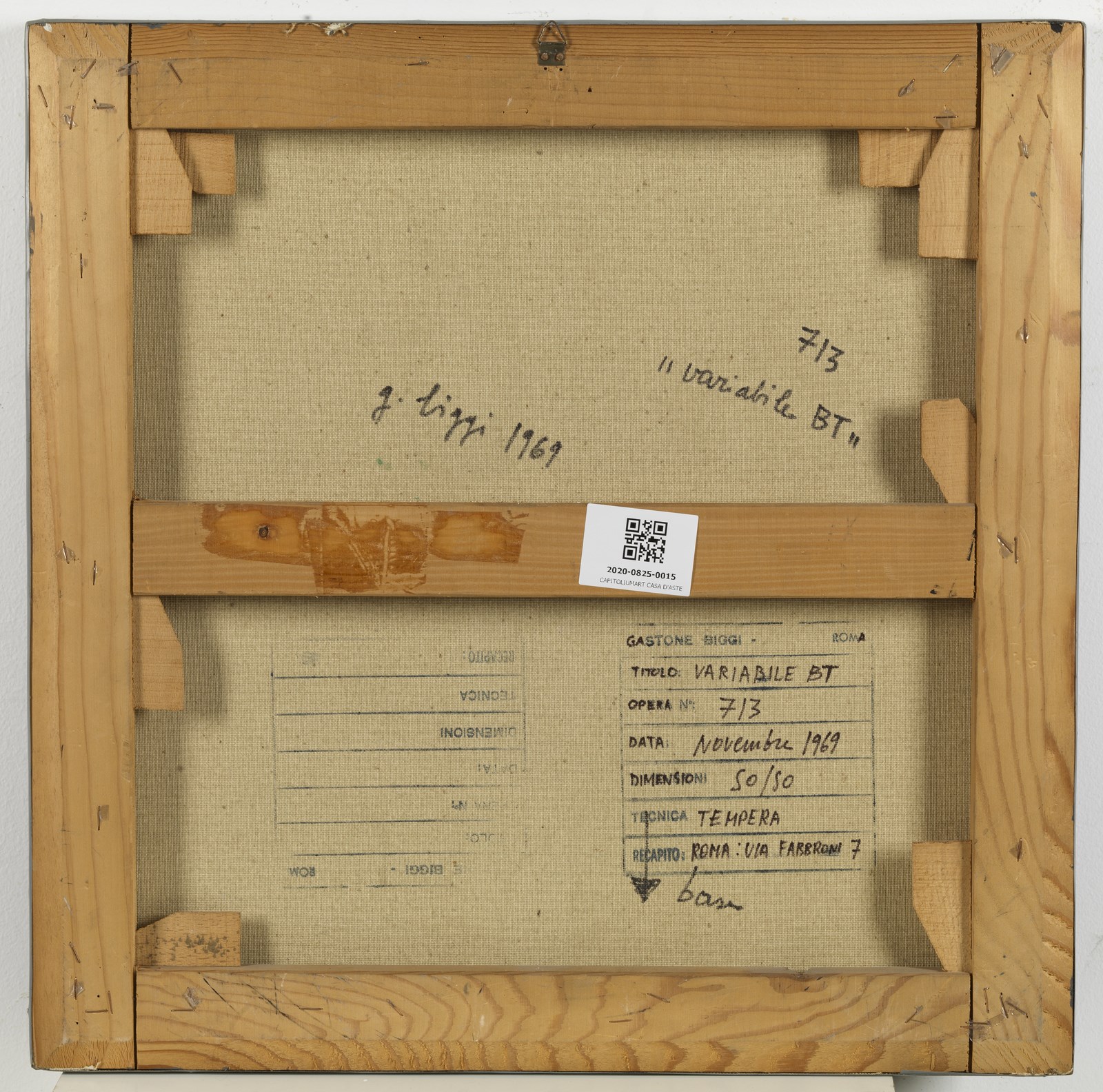 BIGGI GASTONE (1925 - 2014) Variabile Bt. 1969. Tecnica mista su tela. Cm 50,00 x 50,00. Al retro titolo, firma, anno e timbro descrittivo dell'artista.