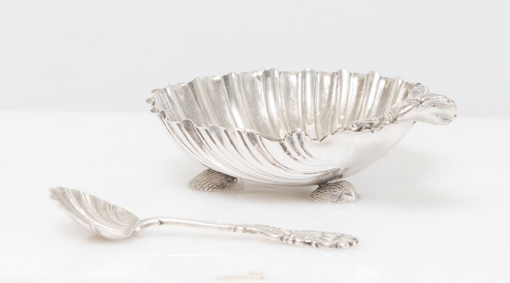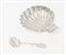 Zuccheriera con cucchiaio a forma di conchiglia in argento 800. Il cucchiaio reca punzoni al retro: 800, Stefani, 9B0. Nel retro della zucchieriera si trovano i medesimi punzoni. Peso complessivo: 240 gr.
