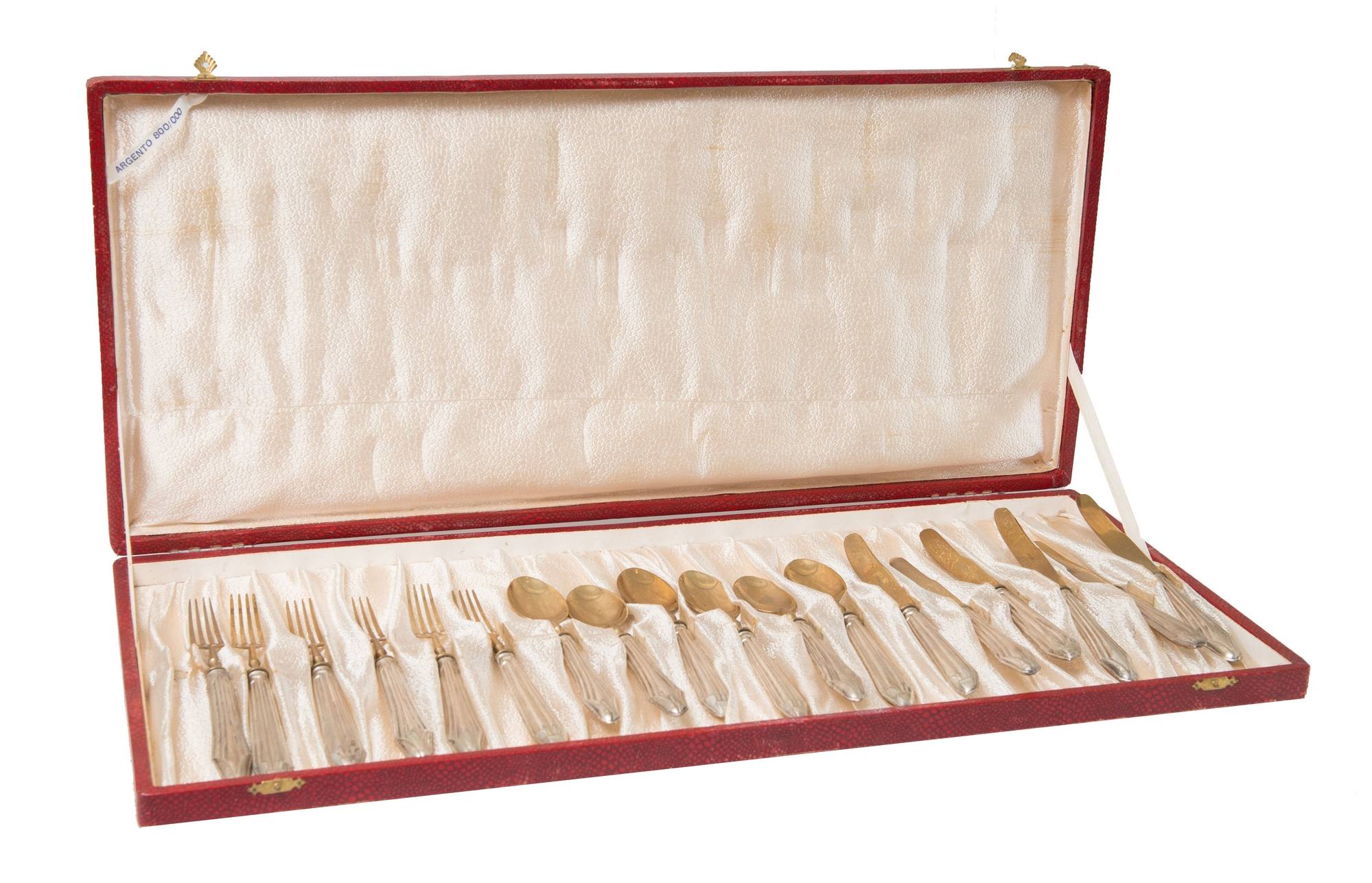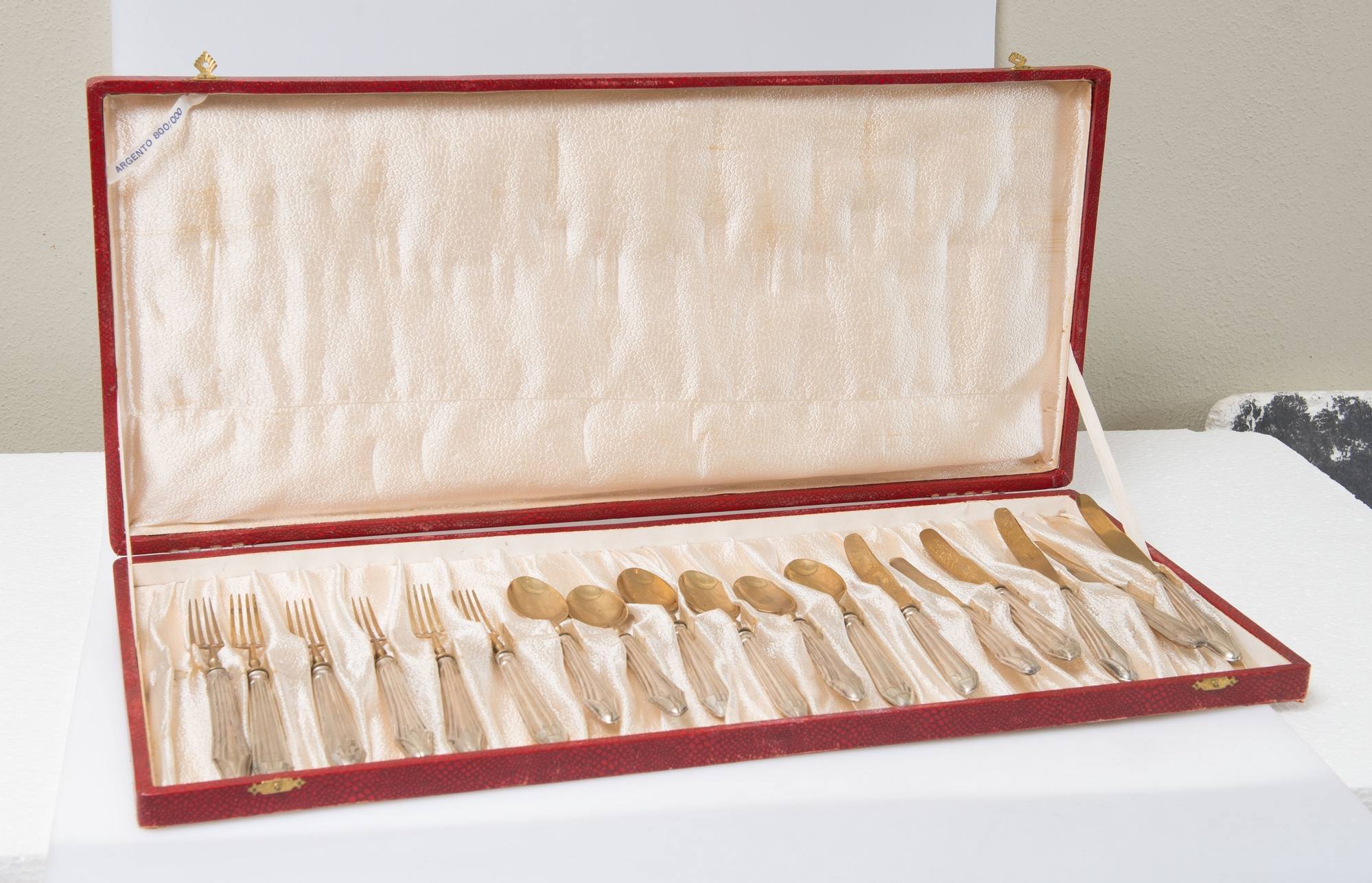 Composto da forchetta, coltello e cucchiaio, con manici in argento 800. Sul manico, ogni posata reca punzone 800.