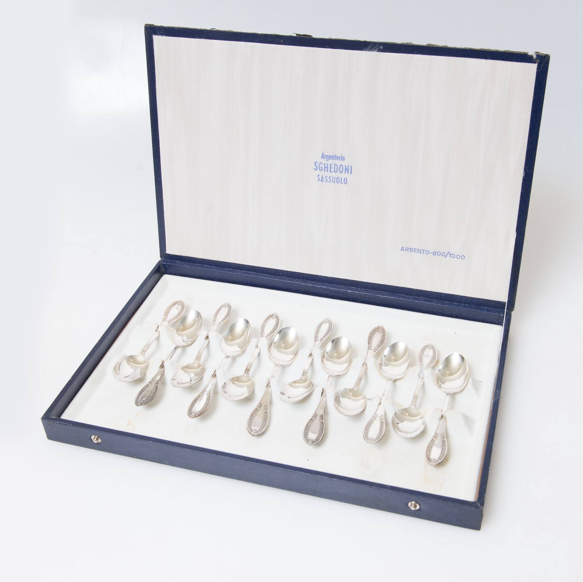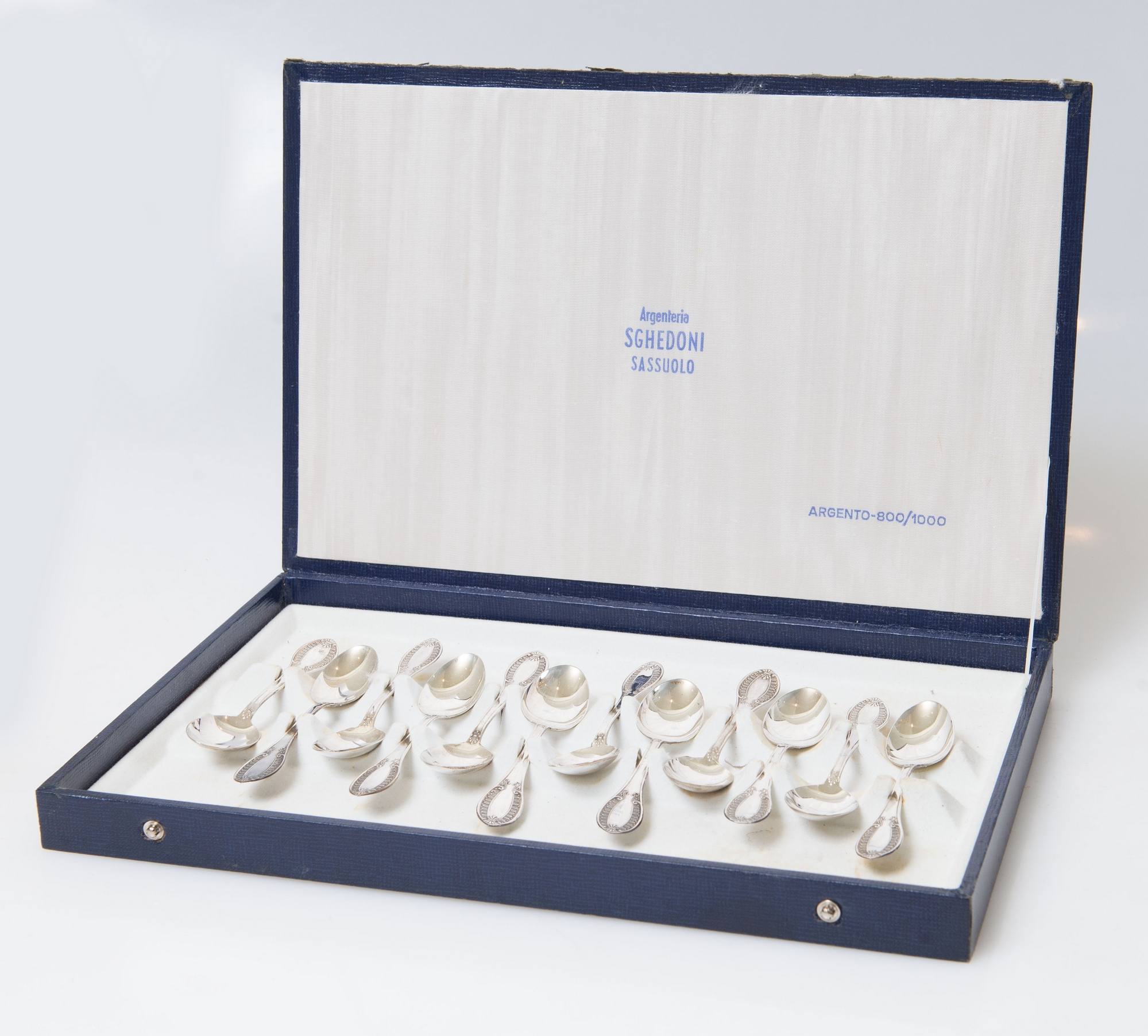 Servizio di dodici cucchiaini in argento 800 entro scatola originale di Sghedoni (Bologna). Sul retro del manico, ogni posata reca punzoni: 800, 76PD.
