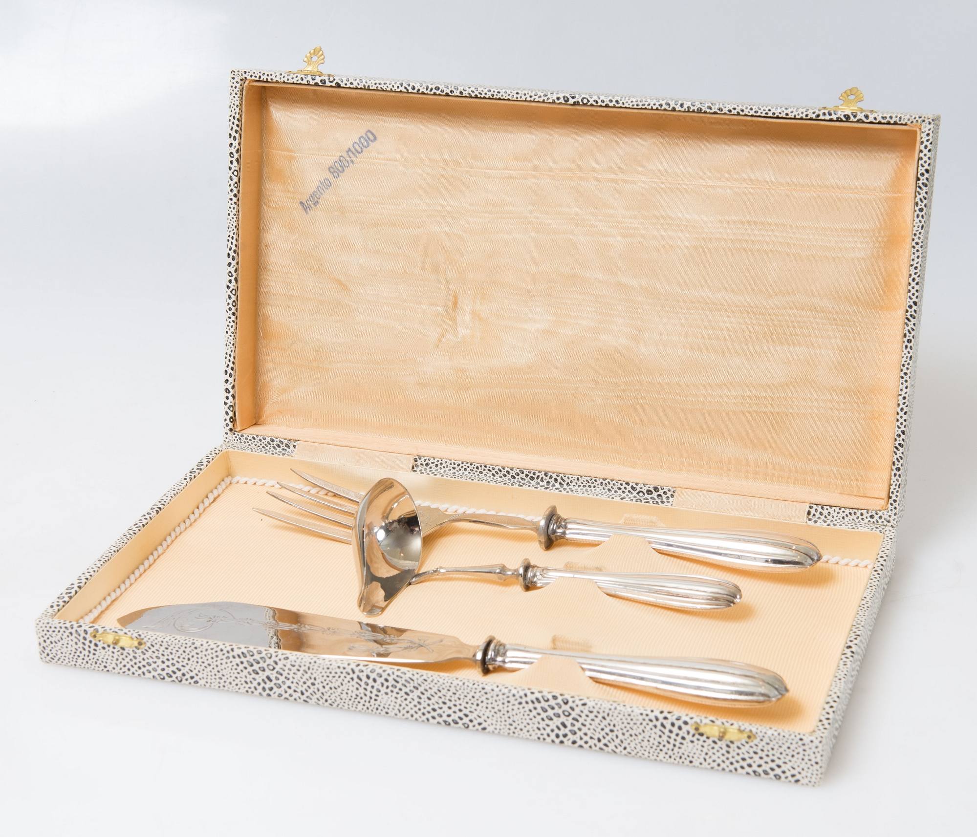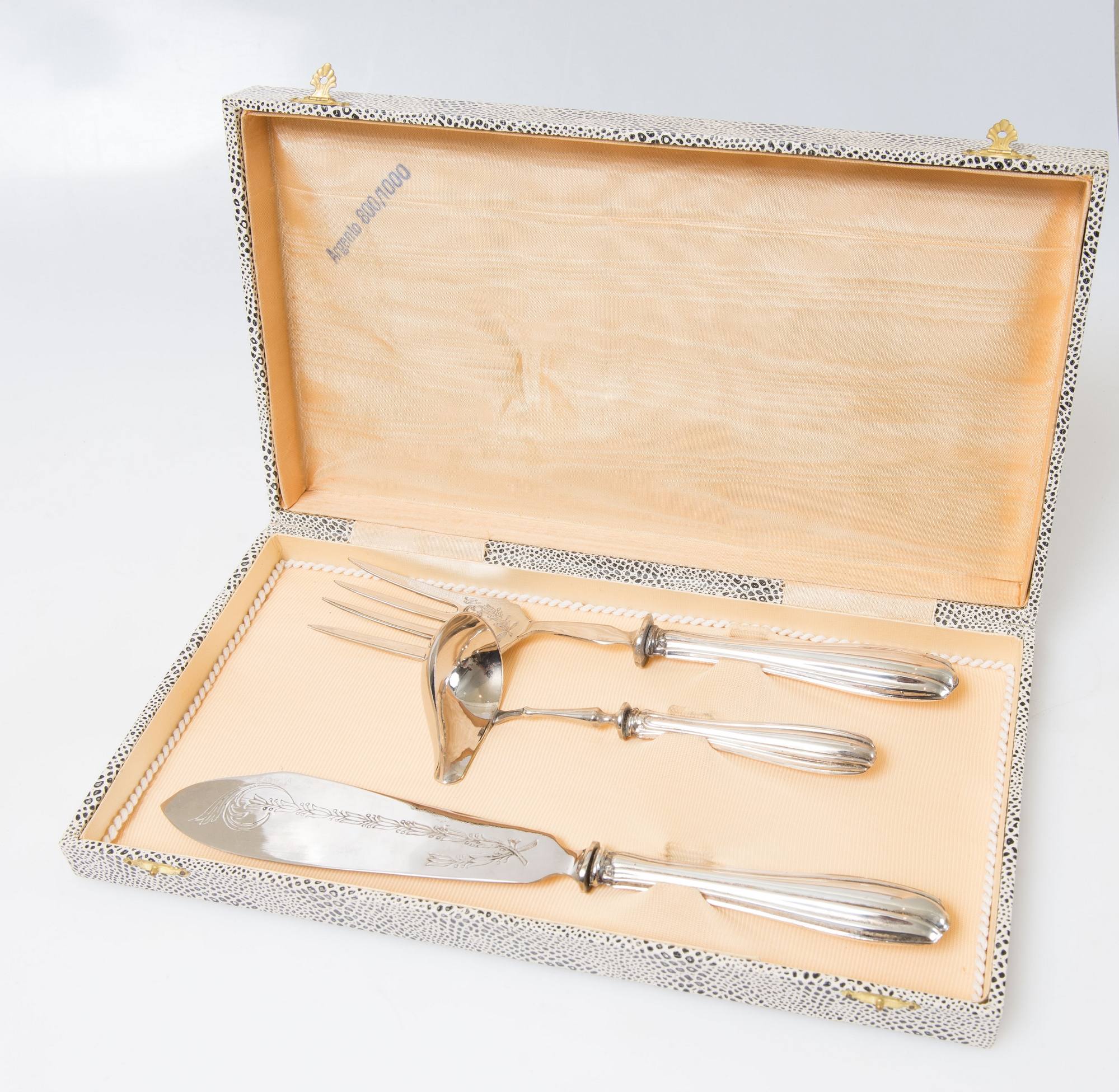 Tre posate da portata in argento 800 entro scatola originale. Sul manico recano punzoni: 800 e 3VC. Peso: 246 gr.