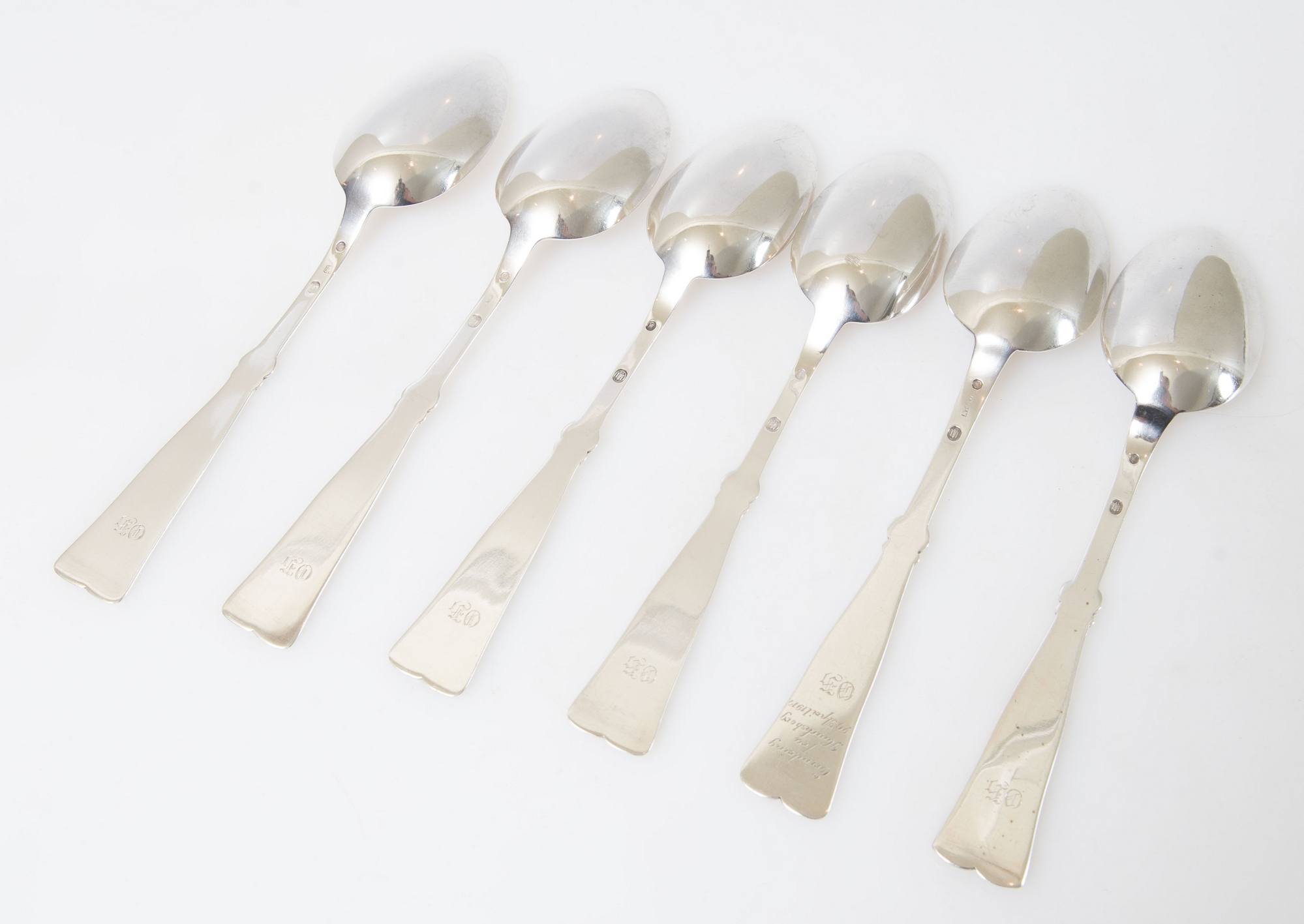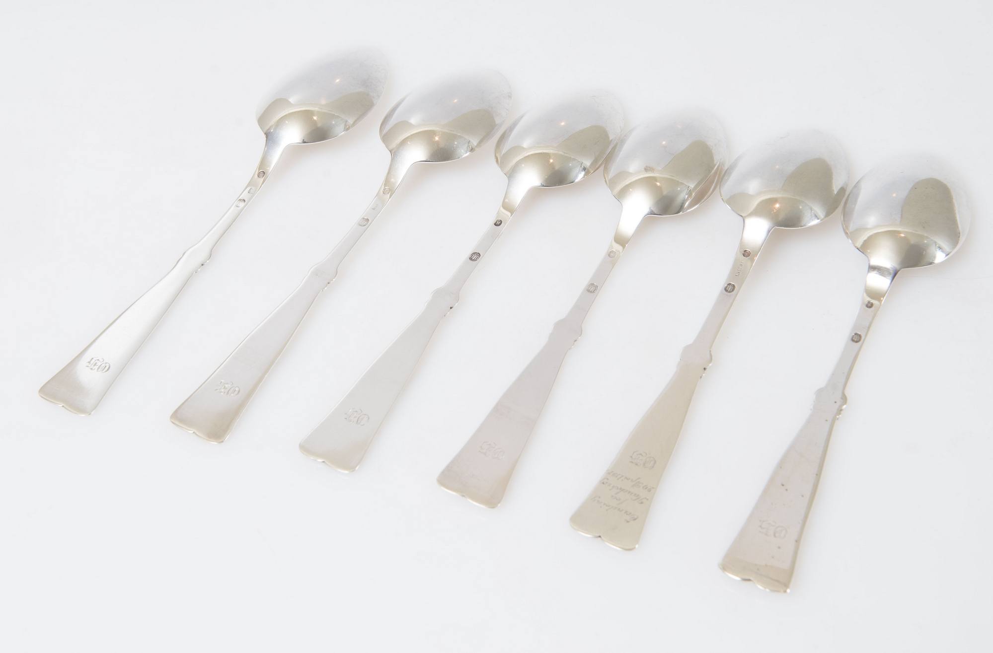 Sei cucchiai in argento con decorazione liberty. Al retro recano punzoni: castello danese e CHF. Peso complessivo: 383 gr.