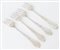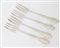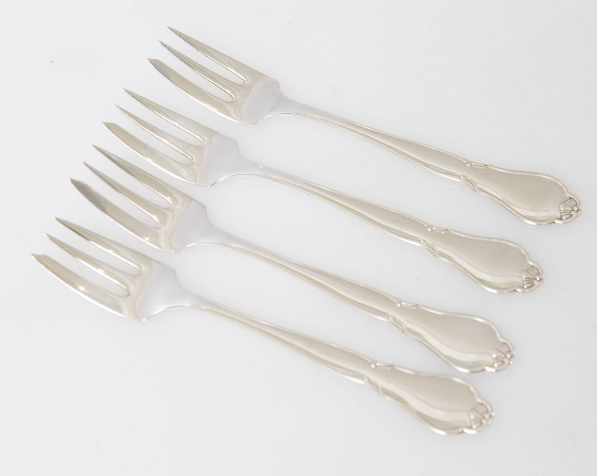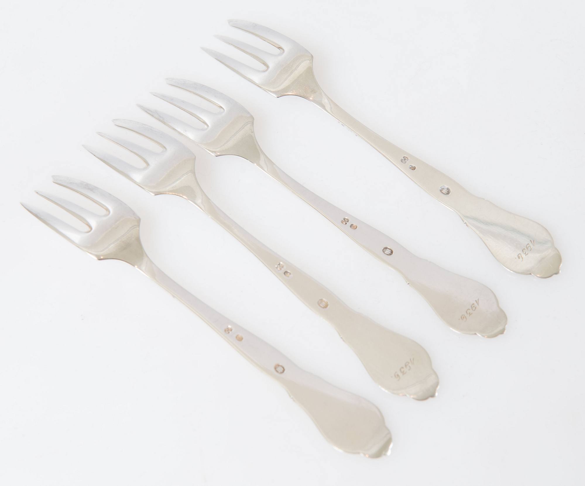 Cinque forchettine in argento con decorazioni liberty. Al retro recano punzoni: castello danese, JS, CMC. Peso complessivo: 83 gr.
