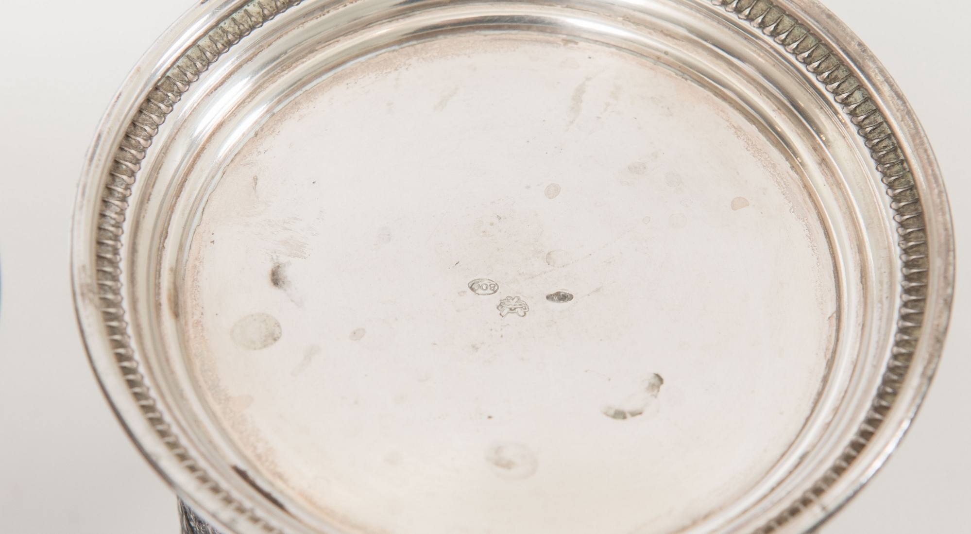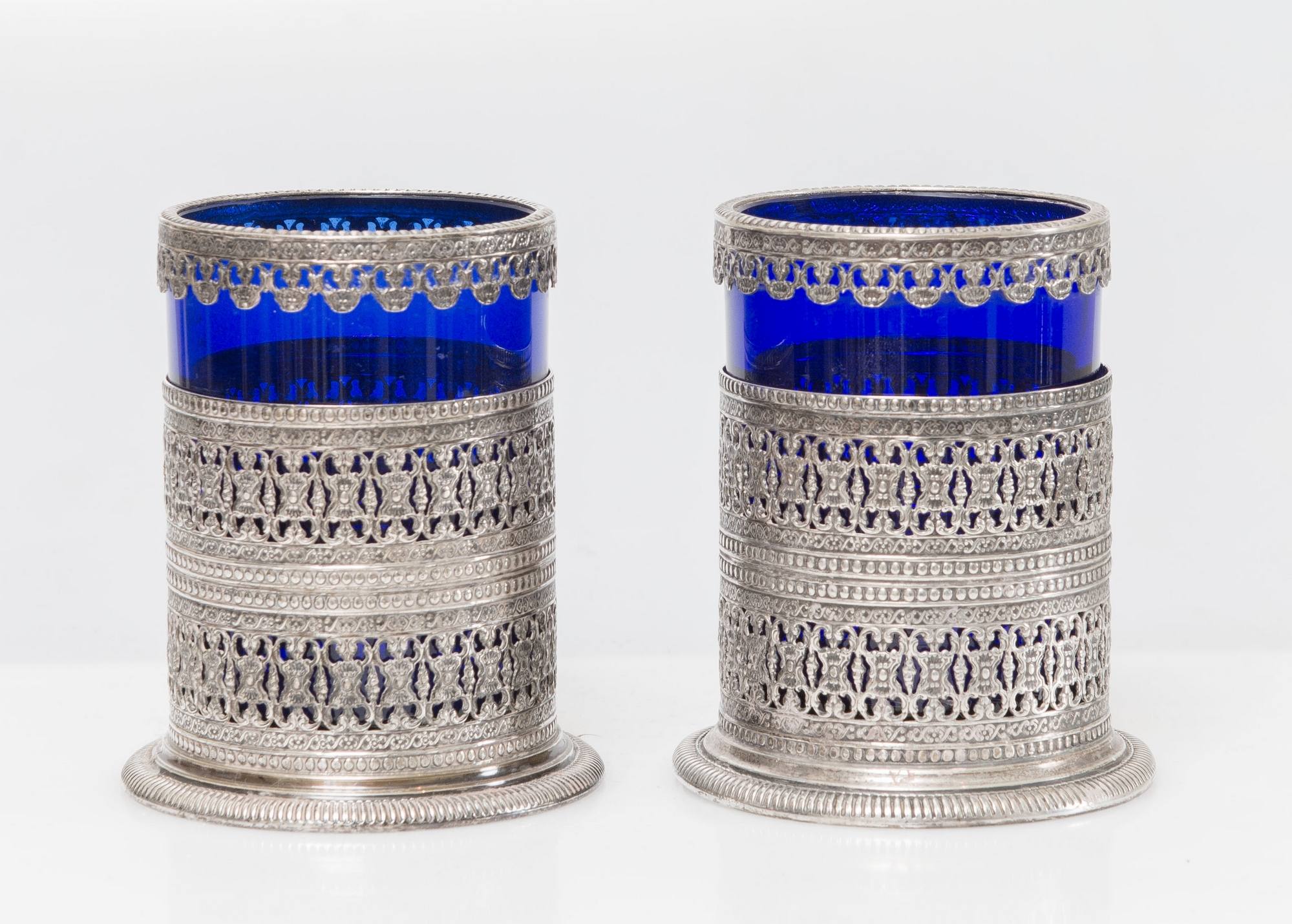 Coppia di bicchieri/portapenne in vetro blu e argento 800. Sul retro recano punzoni: 1AL, 800, Corona con tre torri con forchetta e cucchiaio. Peso dei supporti: 263 gr.