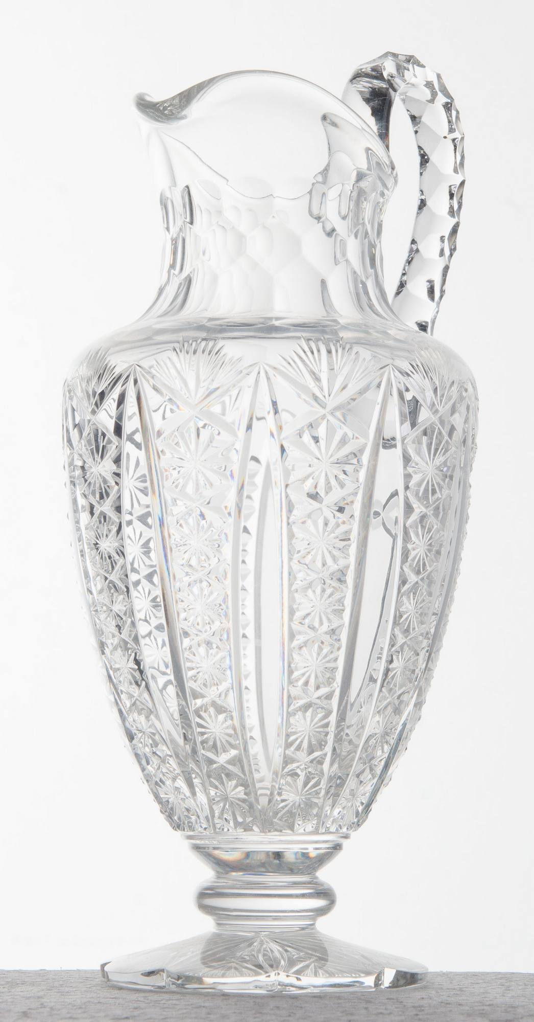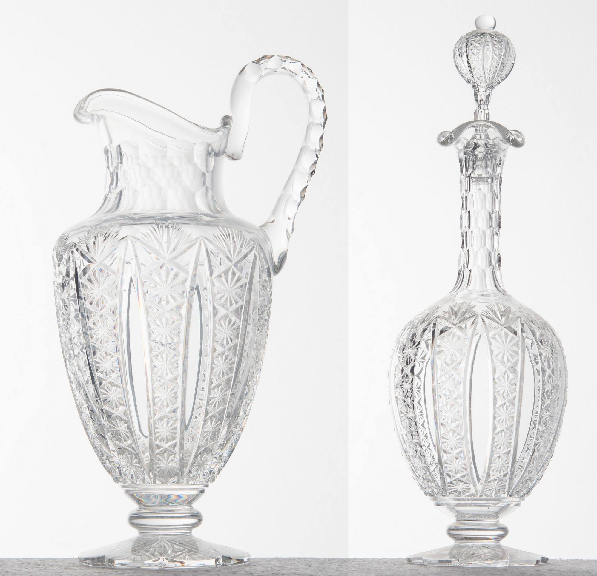BACCARAT, Francia, XX secolo Versatoio e bottiglia con tappo in cristallo. Sul bordo inferiore di entrambi i pezzi è incisa la scritta Baccarat. Rispettivamente di H. cm 16,5 e Ø 13,5; e H. cm 33 e Ø 11.