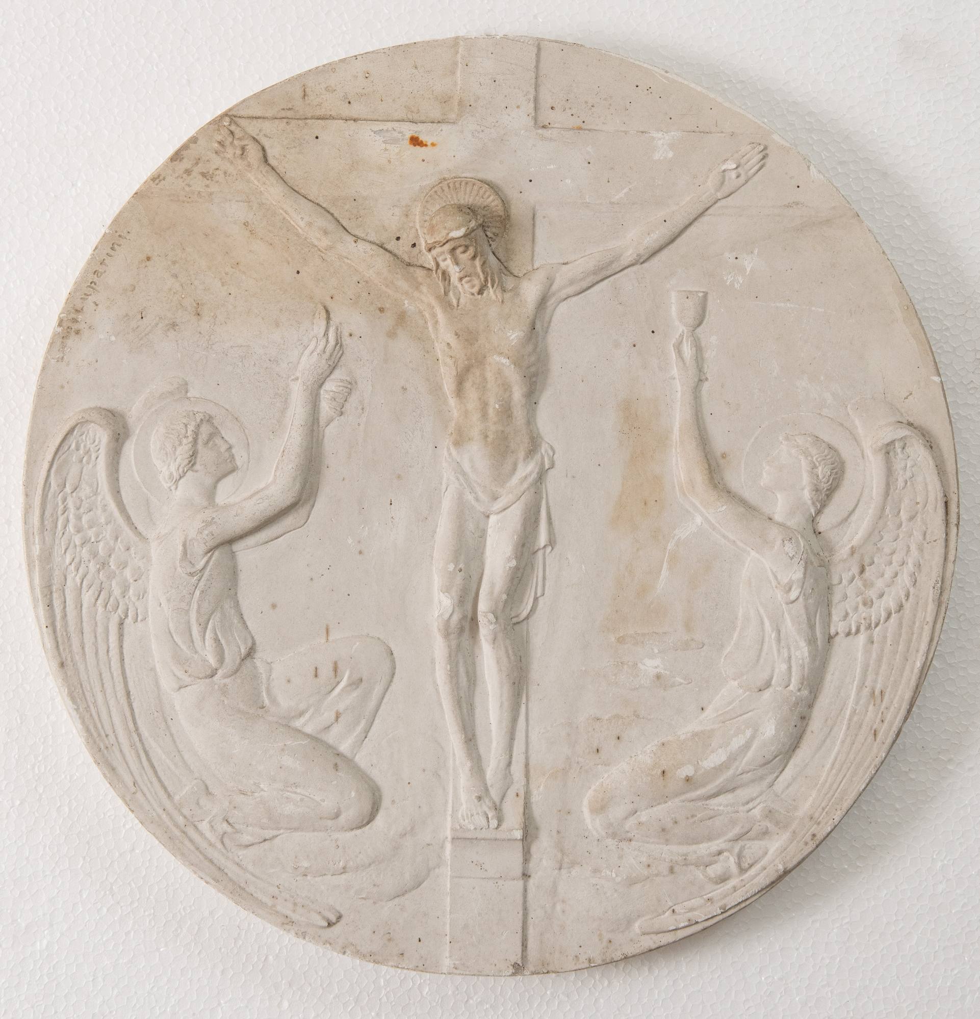 LUIGI LUPARINI (Firenze 1887 – 1943). Calco tondo in gesso rappresentante Crocifissione. Ø cm 41; H. cm 3. Opera firmata in alto a sinistra Luigi Luparini.