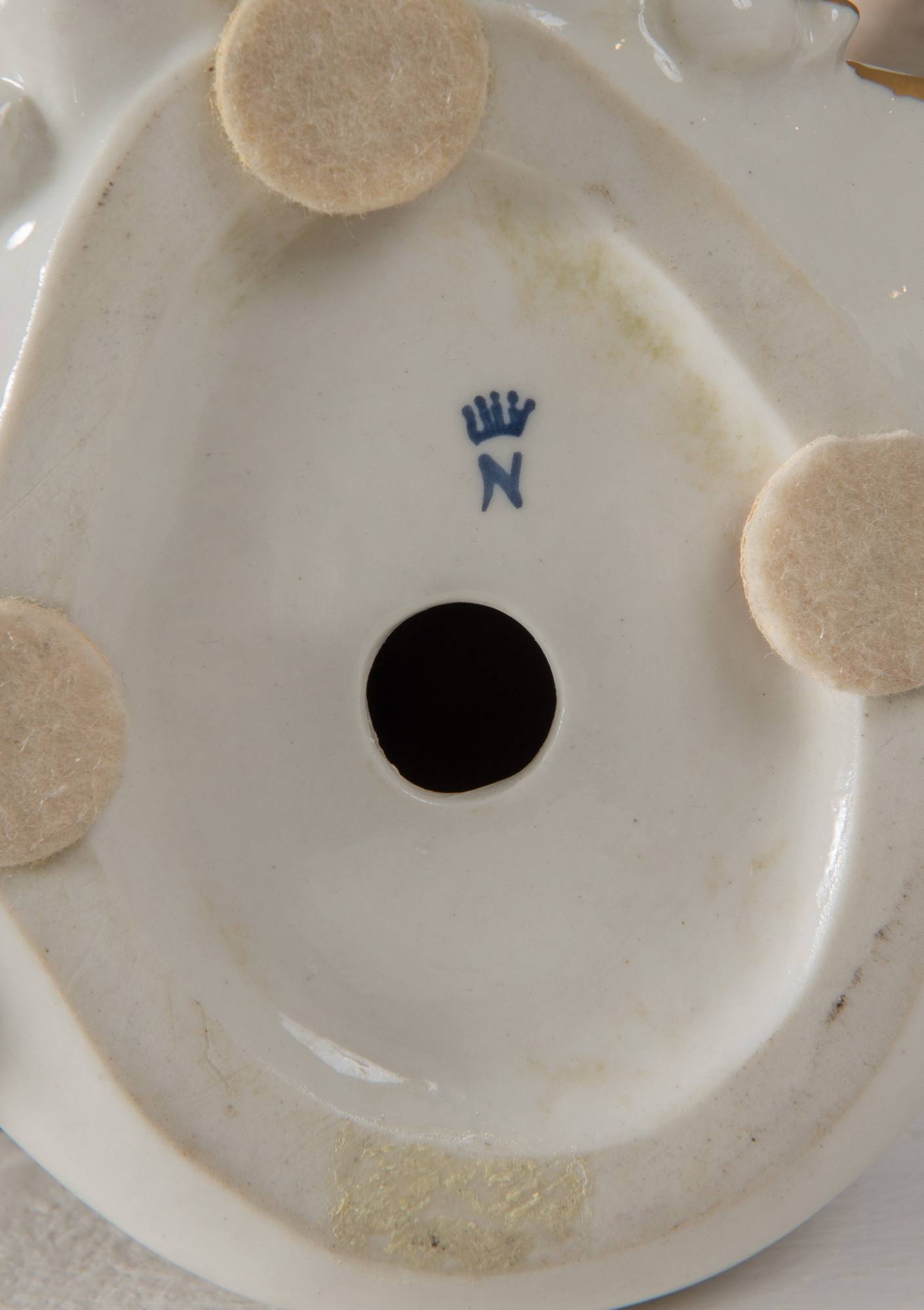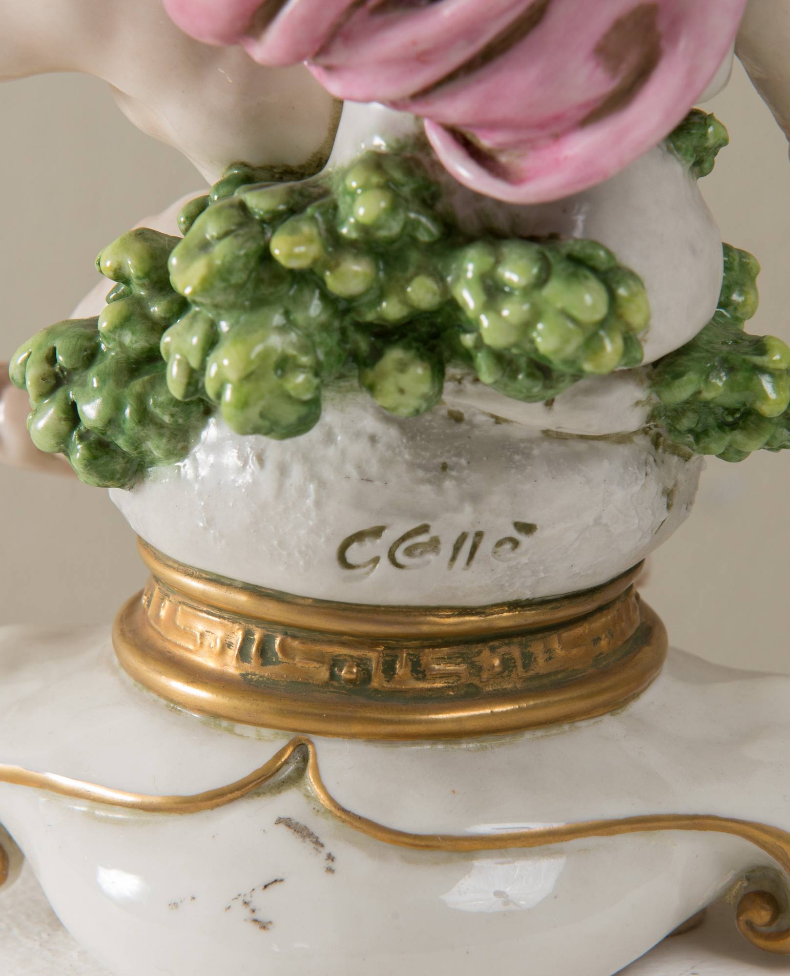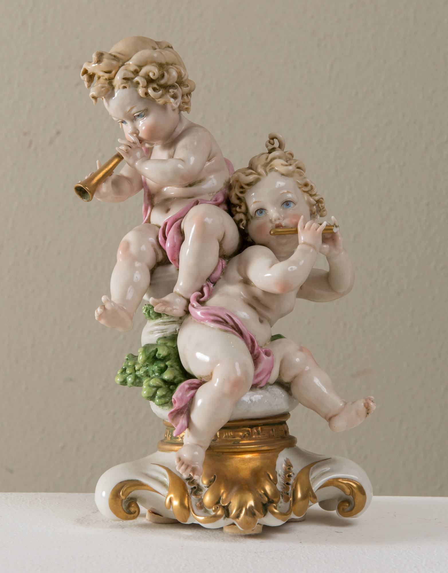 GIUSEPPE CAPPE’ (Cittiglio 1921- Lomagna 2008) "Putti suonatori". Porcellana smaltata firmata al retro Gcappè. Sotto la base in blu reca marchio N coronata. Cm 24x13x11. Difetti.