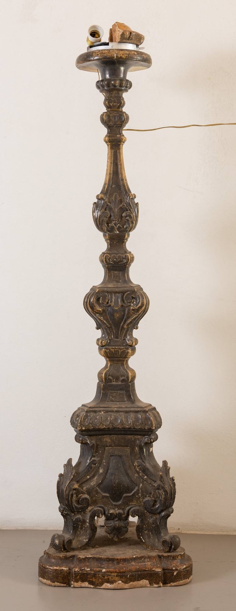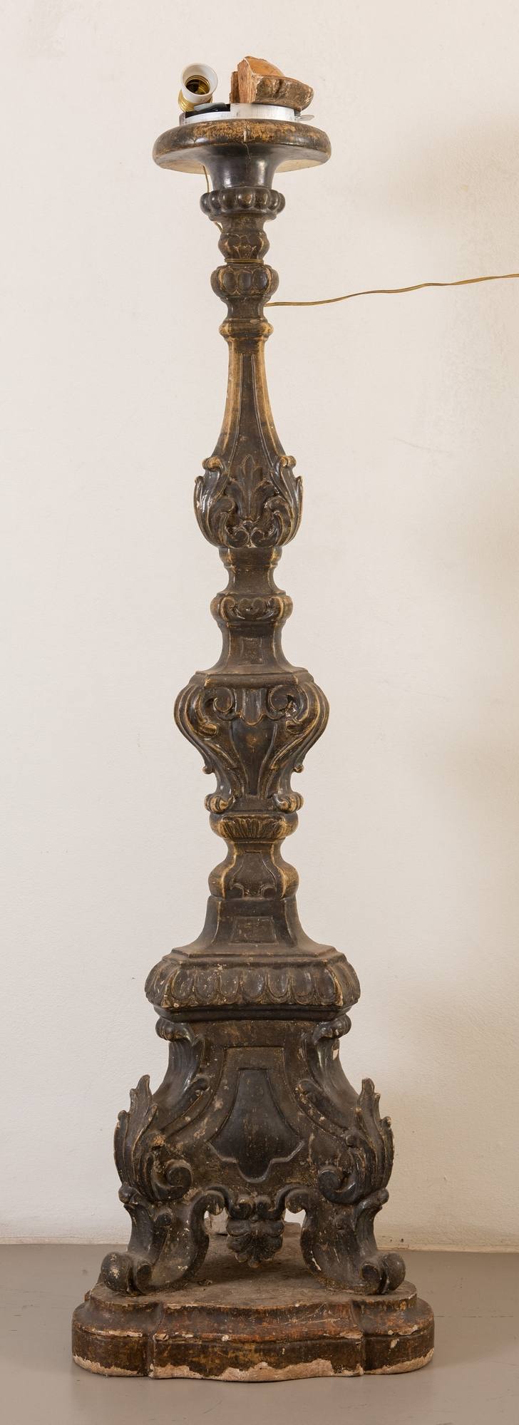 Candelabro intagliato e argentato. Metà XVIII secolo. Cm 141x39,5x36.