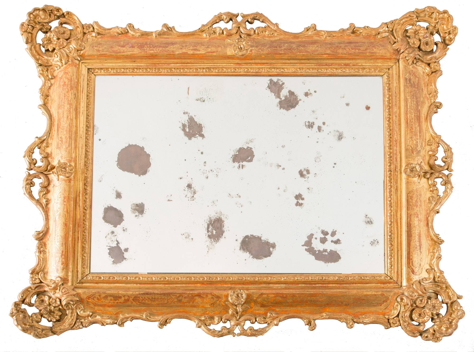 Specchiera, XIX secolo. La cornice presenta riserve lavorate a bulino e angoli in pastiglia con motivi floreali e fitomorfi. Lo specchio è coevo alla cornice. Cm 119x143x9. Lievi difetti.