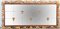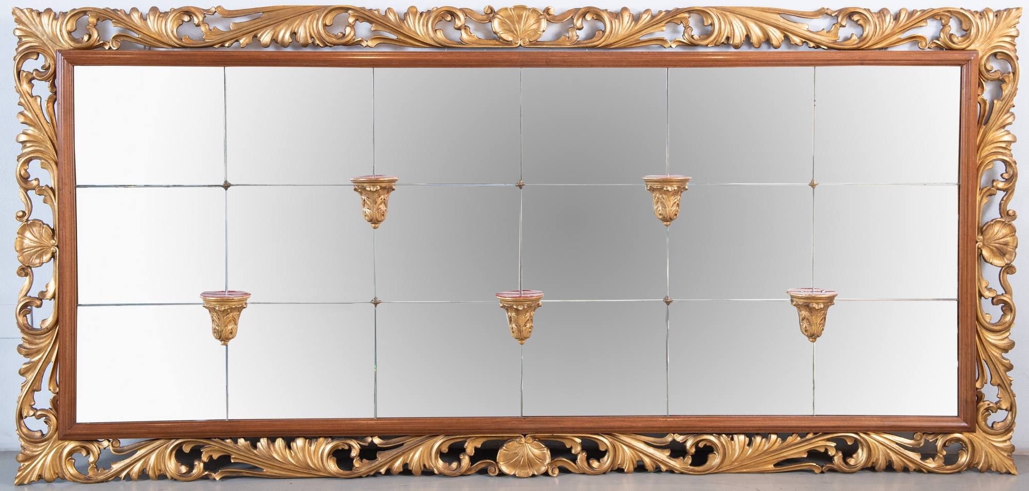 Specchiera intagliata e dorata. Anni '50 del XX secolo. Cornice con volute intagliate e mensole reggipiatti applicate sul fondo di specchi composti. Cm 105x224x3. Lievi difetti.
