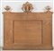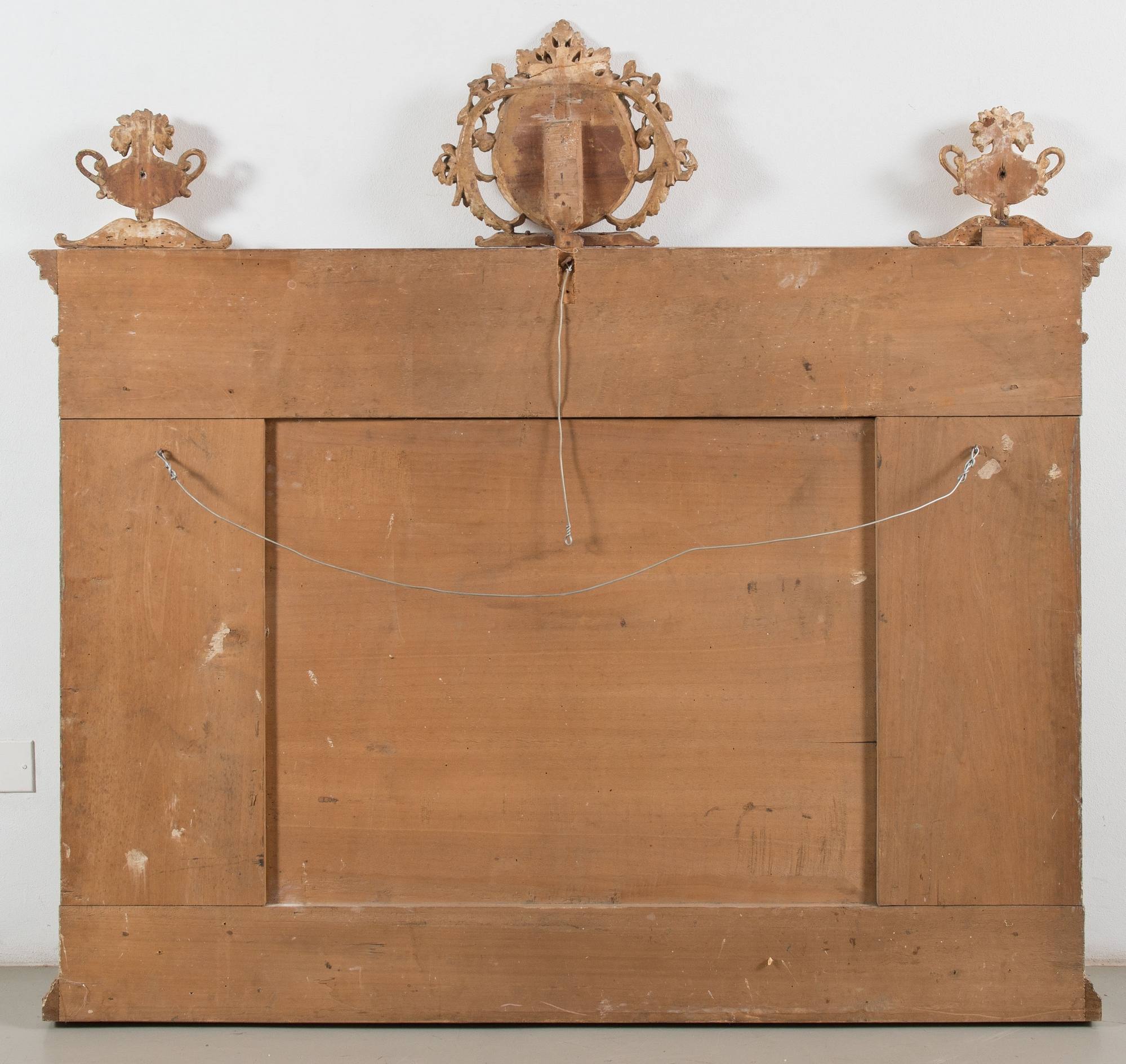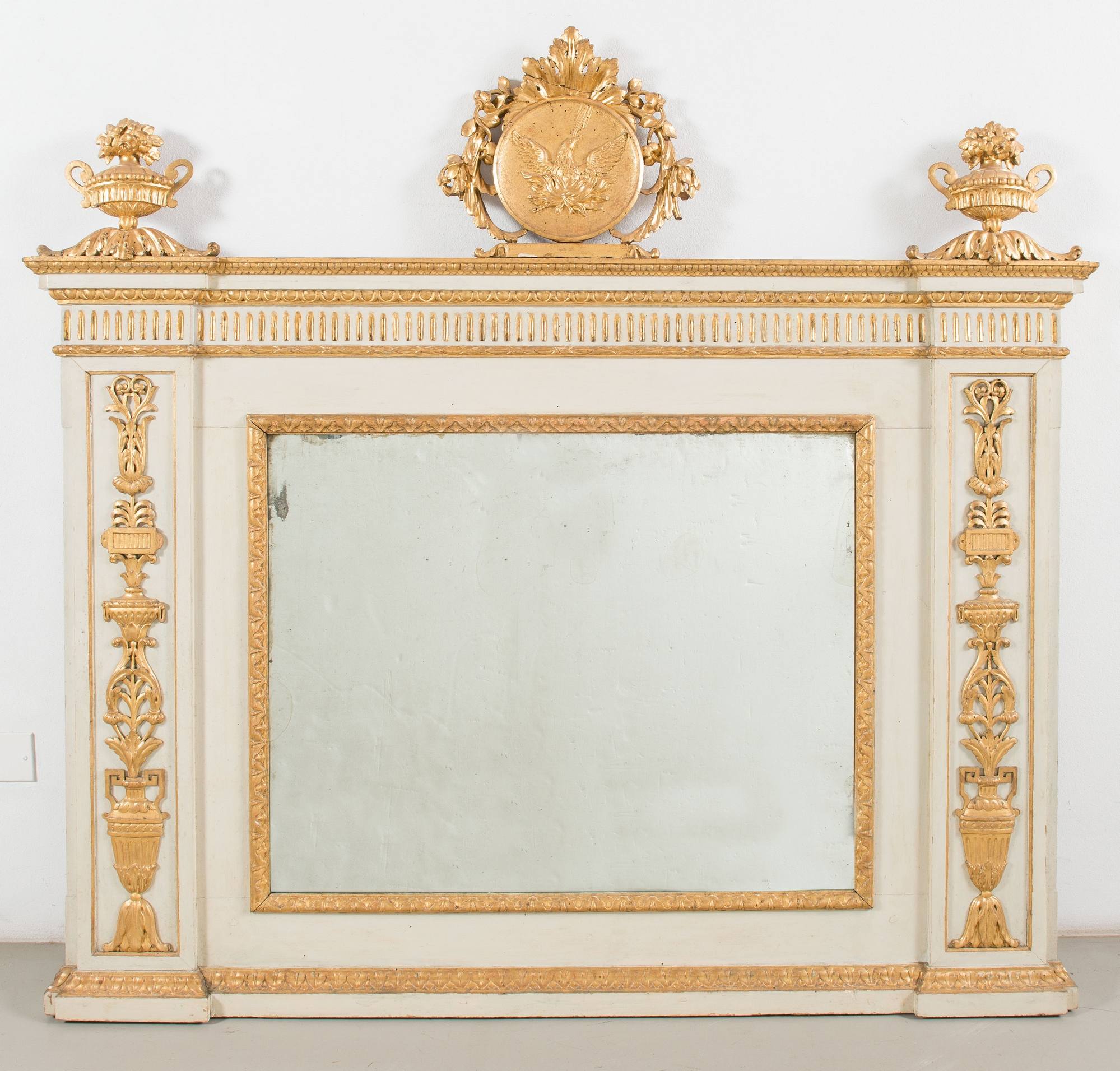 Caminiera degli inizi del XIX secolo. Laccata e dorata. Specchio coevo al mercurio incorniciato da cornice dorata intagliata a guisa di foglie. Paraste laterali con candelabre intagliate e dorate. Cornice dorata alla base e alla sommità. Cimasa centrale con fenice e vasi dorati con fogliato, fiori e manici ai lati. Cm 144x154x9. Lievi difetti.