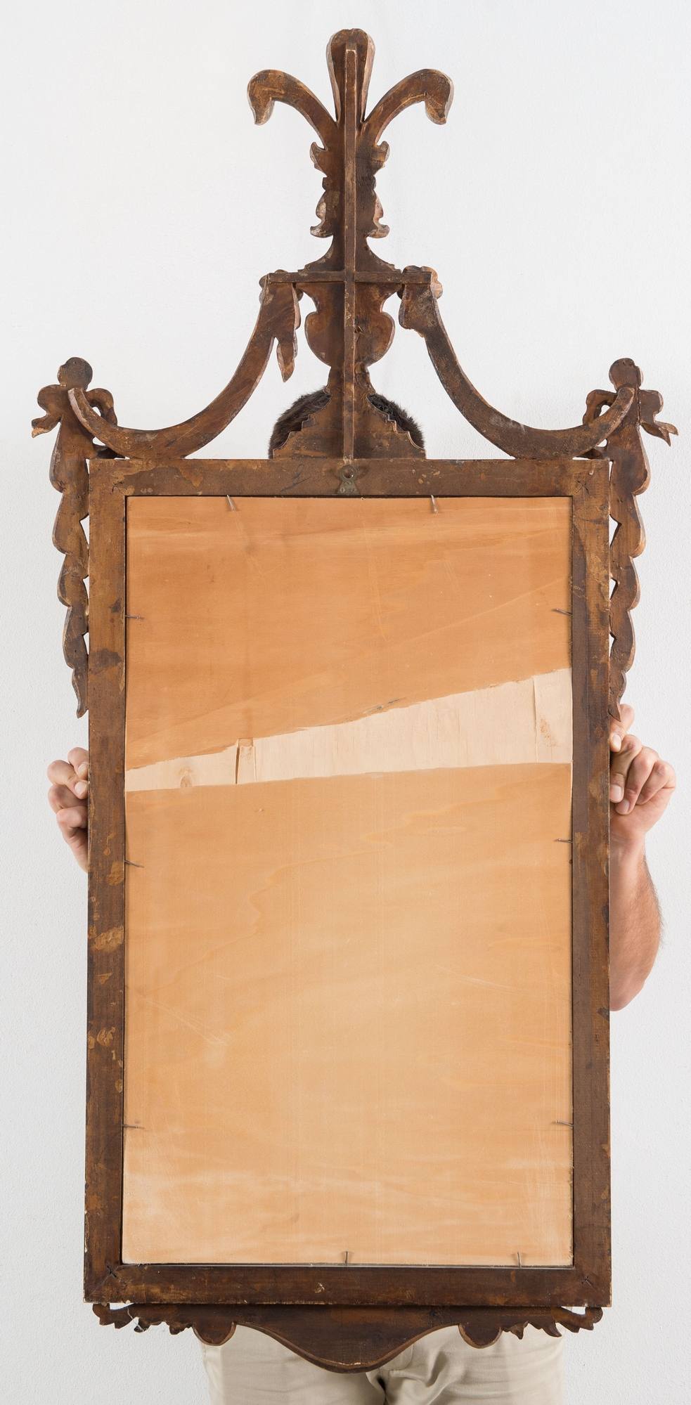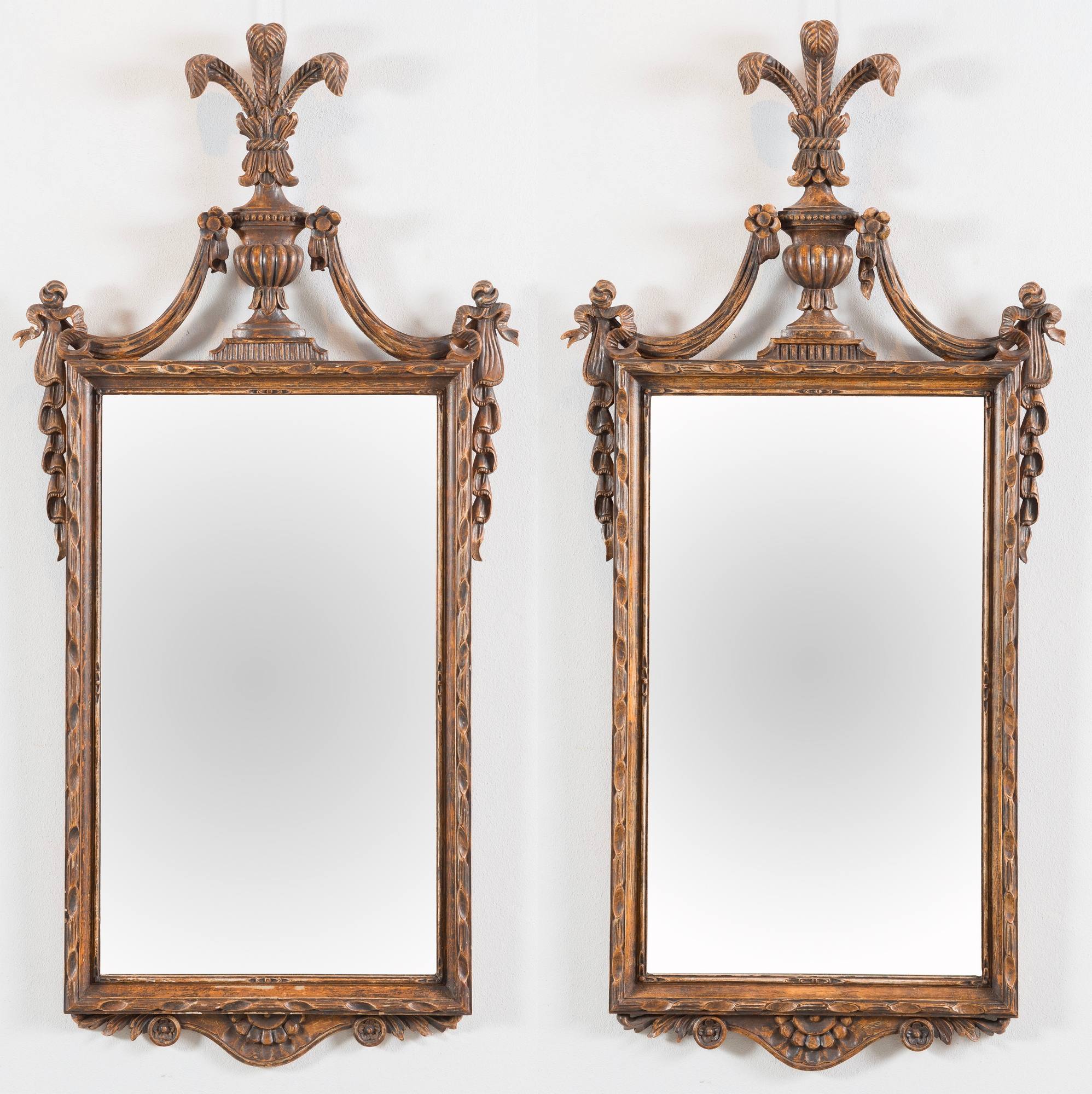 Coppia di specchiere in stile Luigi XVI. Realizzate negli anni '50 del XX secolo. Cornice con motivo a nastro arrotolato. Cimasa con vaso centrale con pinnacchio e drappi degradanti con calate e nodi. Cadauna di cm 129x63x3,5. Lievi difetti.