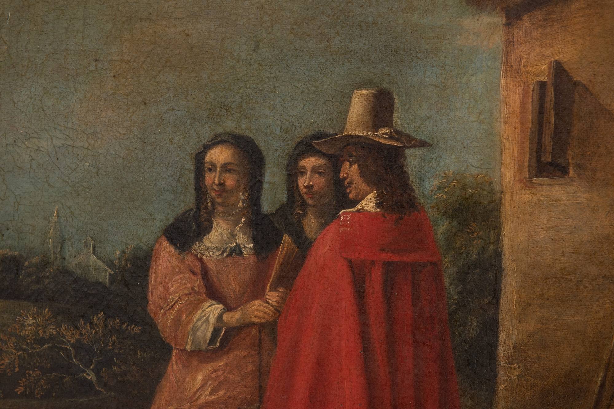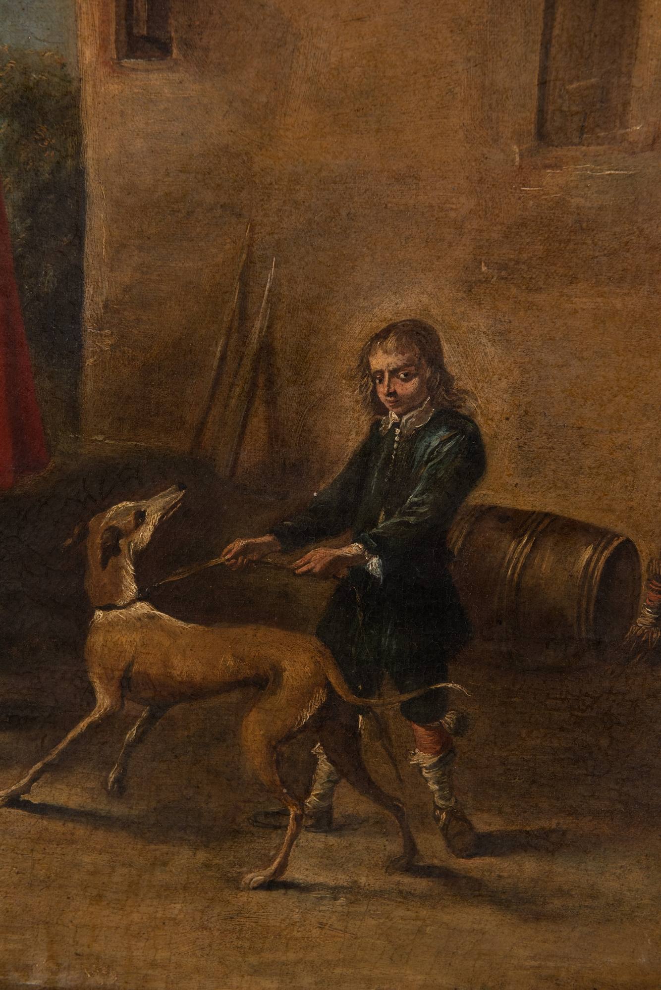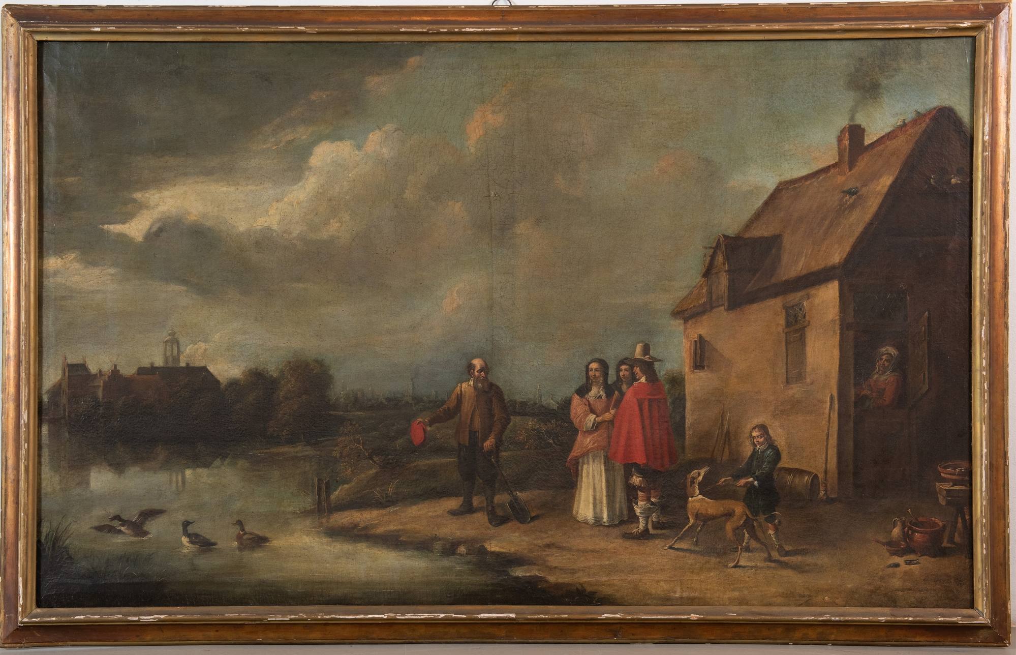 Atelier di David Teniers II ( Anversa 1610 - Bruxelles 1690) "Paesaggio con astanti", tradizionalmente noto come “La famiglia del pittore Teniers”. Olio su tela. Cm 114x190. L’opera è firmata in basso a destra: D. Teniers, con data 1673. Della composizione è nota anche un’altra versione, di dimensioni leggermente inferiori, conservata presso la collezione della Regina d’Inghilterra, come riportato dalla letteratura degli anni 1649-50. Il dipinto in questione è stato realizzato nello studio di Teniers, probabilmente sotto diretto controllo del maestro. Sono presenti piccole variazioni rispetto al corrispettivo inglese, non è comunque da escludere la piena attribuzione al pittore di Anversa, nonostante non sia possibile sciogliere i dubbi riguardo l’autografia della tela, alla luce dell’alterazione di vecchie vernici che non permette di apprezzarne la croma e rendendo, al contempo, difficile decifrare i dettagli. Anche se da tradizione viene identificato come una rappresentazione della famiglia dell’artista, si tratta in realtà di una mise en scene dell’importanza di classe raggiunta nel Seicento dal pittore. In primo piano sono presenti un gentiluomo e due dame che passeggiano nella propria tenuta, mentre un fattore indica loro le anatre che nuotano nello stagno. Lievemente in disparte, un giovane paggetto tenta di trattenere un levriero, come fosse nell’atto di lanciarsi in una corsa in direzione delle anatre. La sicurezza con cui i proprietari di casa sembrano presentarsi all’artista sta a sottolineare lo status assunto dallo stesso all’interno della società coeva.