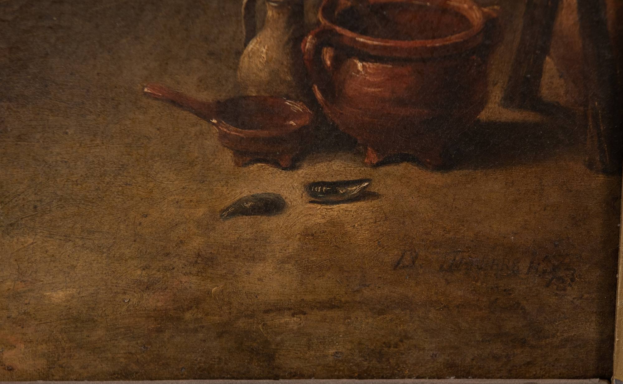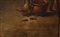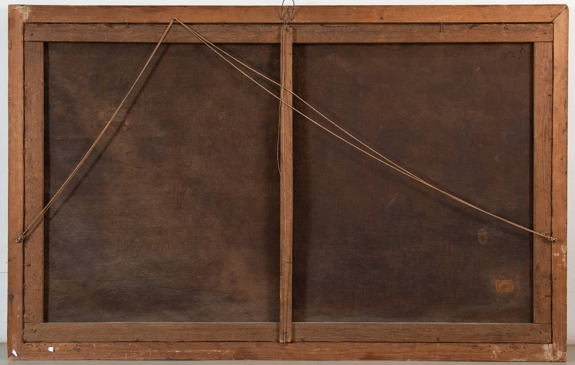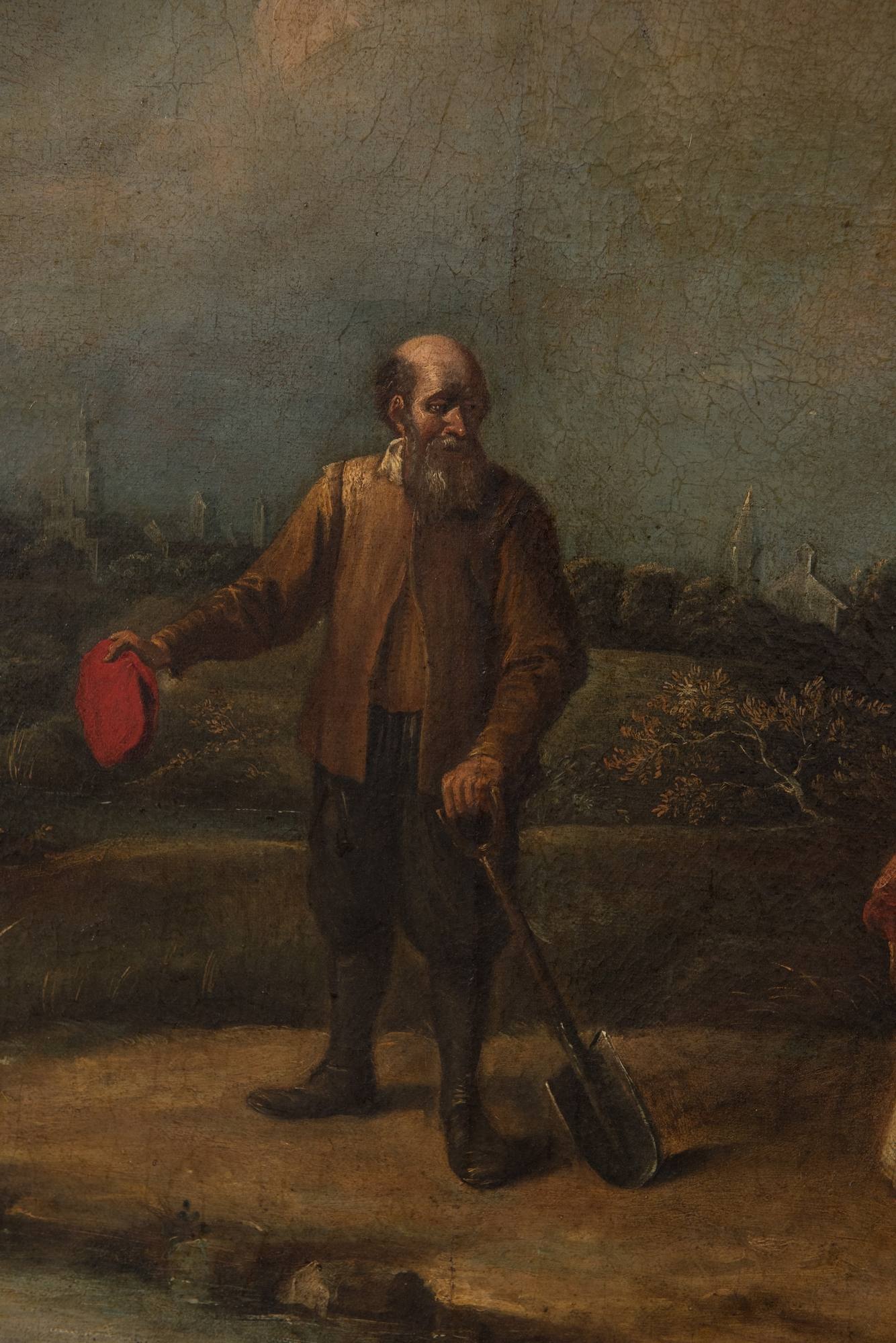 Atelier di David Teniers II ( Anversa 1610 - Bruxelles 1690) "Paesaggio con astanti", tradizionalmente noto come “La famiglia del pittore Teniers”. Olio su tela. Cm 114x190. L’opera è firmata in basso a destra: D. Teniers, con data 1673. Della composizione è nota anche un’altra versione, di dimensioni leggermente inferiori, conservata presso la collezione della Regina d’Inghilterra, come riportato dalla letteratura degli anni 1649-50. Il dipinto in questione è stato realizzato nello studio di Teniers, probabilmente sotto diretto controllo del maestro. Sono presenti piccole variazioni rispetto al corrispettivo inglese, non è comunque da escludere la piena attribuzione al pittore di Anversa, nonostante non sia possibile sciogliere i dubbi riguardo l’autografia della tela, alla luce dell’alterazione di vecchie vernici che non permette di apprezzarne la croma e rendendo, al contempo, difficile decifrare i dettagli. Anche se da tradizione viene identificato come una rappresentazione della famiglia dell’artista, si tratta in realtà di una mise en scene dell’importanza di classe raggiunta nel Seicento dal pittore. In primo piano sono presenti un gentiluomo e due dame che passeggiano nella propria tenuta, mentre un fattore indica loro le anatre che nuotano nello stagno. Lievemente in disparte, un giovane paggetto tenta di trattenere un levriero, come fosse nell’atto di lanciarsi in una corsa in direzione delle anatre. La sicurezza con cui i proprietari di casa sembrano presentarsi all’artista sta a sottolineare lo status assunto dallo stesso all’interno della società coeva.