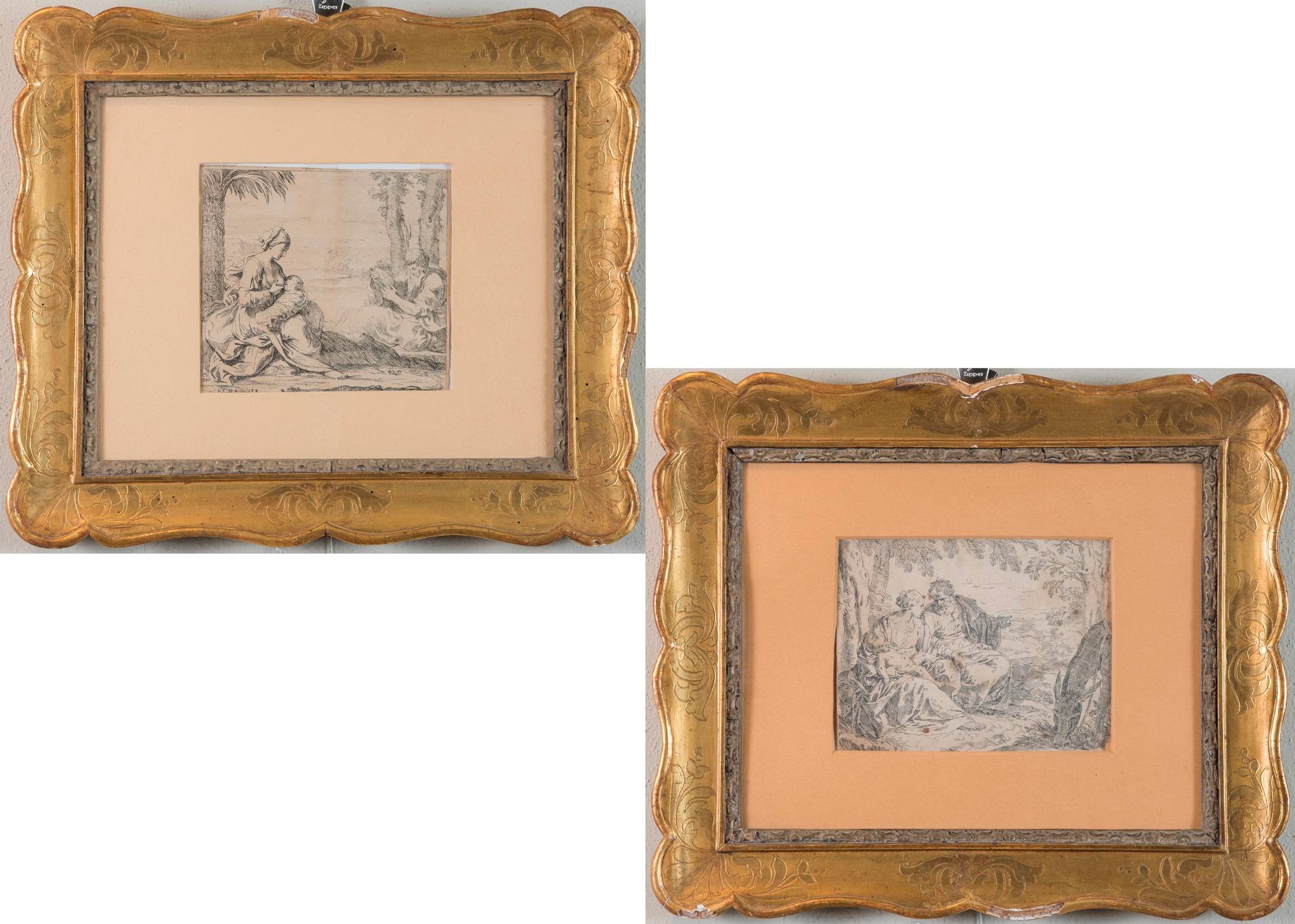 Coppia di incisioni in elegante cornice cabaret. Incisioni: rispettivamente di cm 15x20 e 16,5x19.