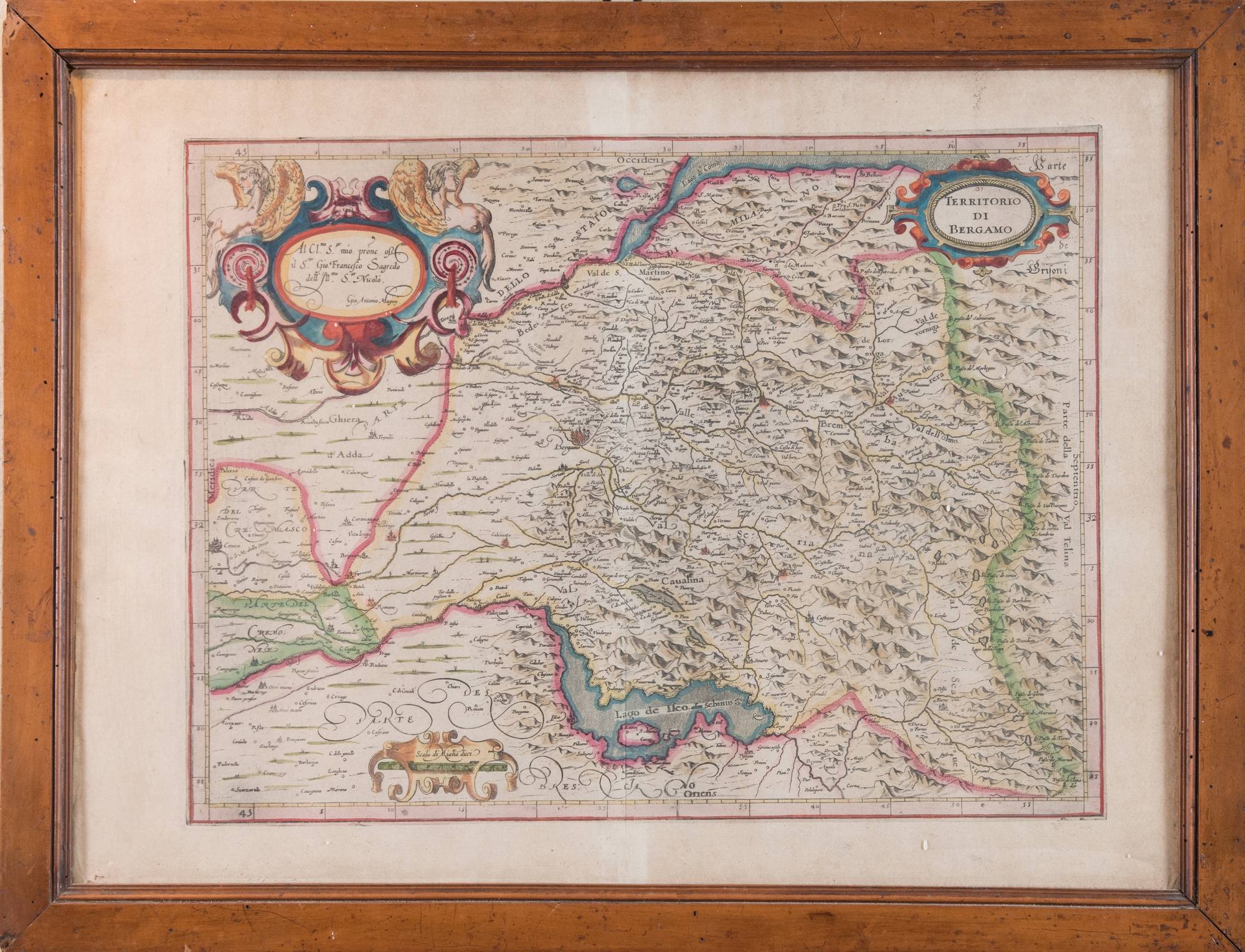 GIOVANNI ANTONIO MAGINI (Padova 1555 - Bologna 1617) "Territorio di Bergamo". Incisione ad acquaforte con interventi ad acquerello originali. Cm 35x46,5. La carta geografica è tratta da L'Italia a cura di Fabio Magini, edito a Bologna tra il 1620 ed il 1640.