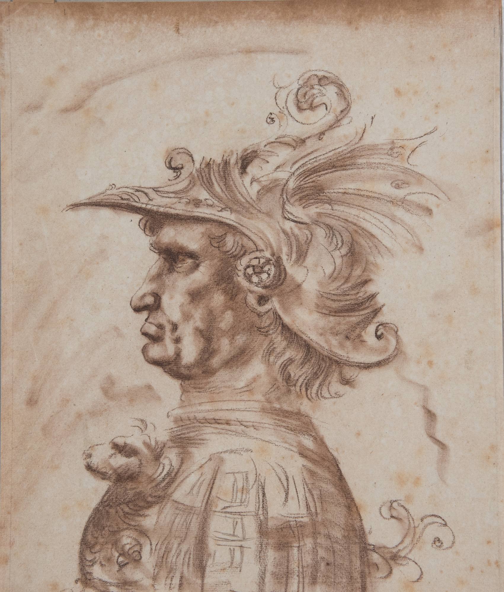 Pittore anonimo del XIX secolo Disegno su carta raffigurante un condottiero di Leonardo Da Vinci. L’originale si trova al British Museum di Londra (inv. 1895,0915.474). Cm 31x26.