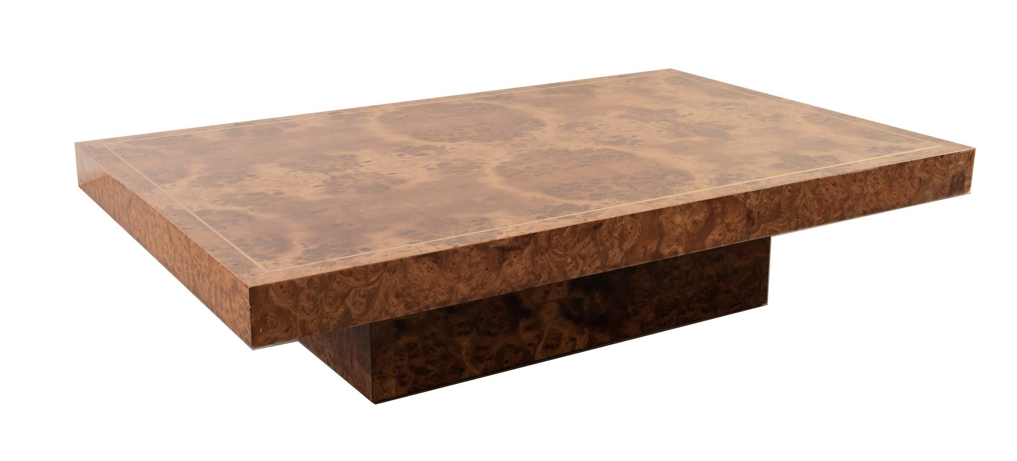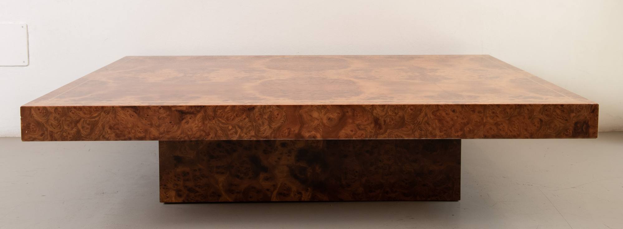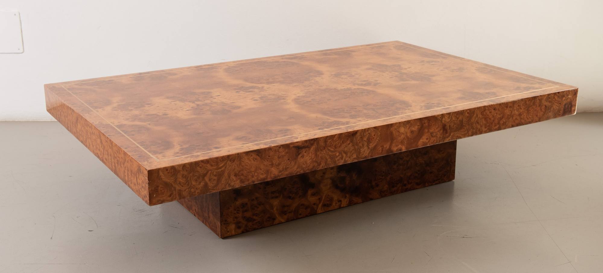 Tavolino impiallacciato in radica di olmo con filettatura in ottone. Anni '70 del XX secolo. Cm 33x141x90. Lievi difetti.