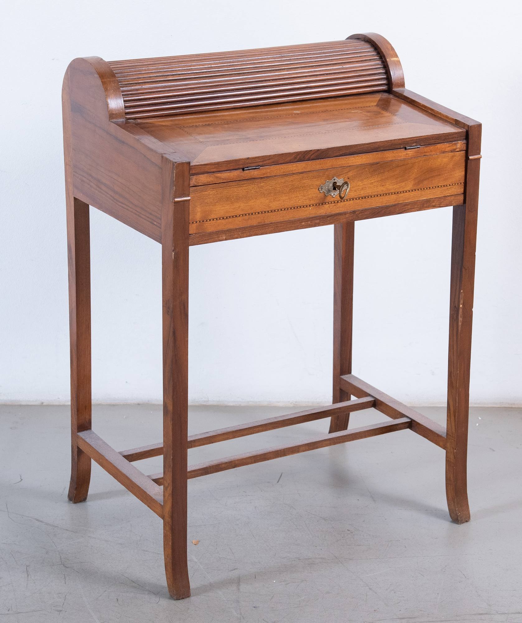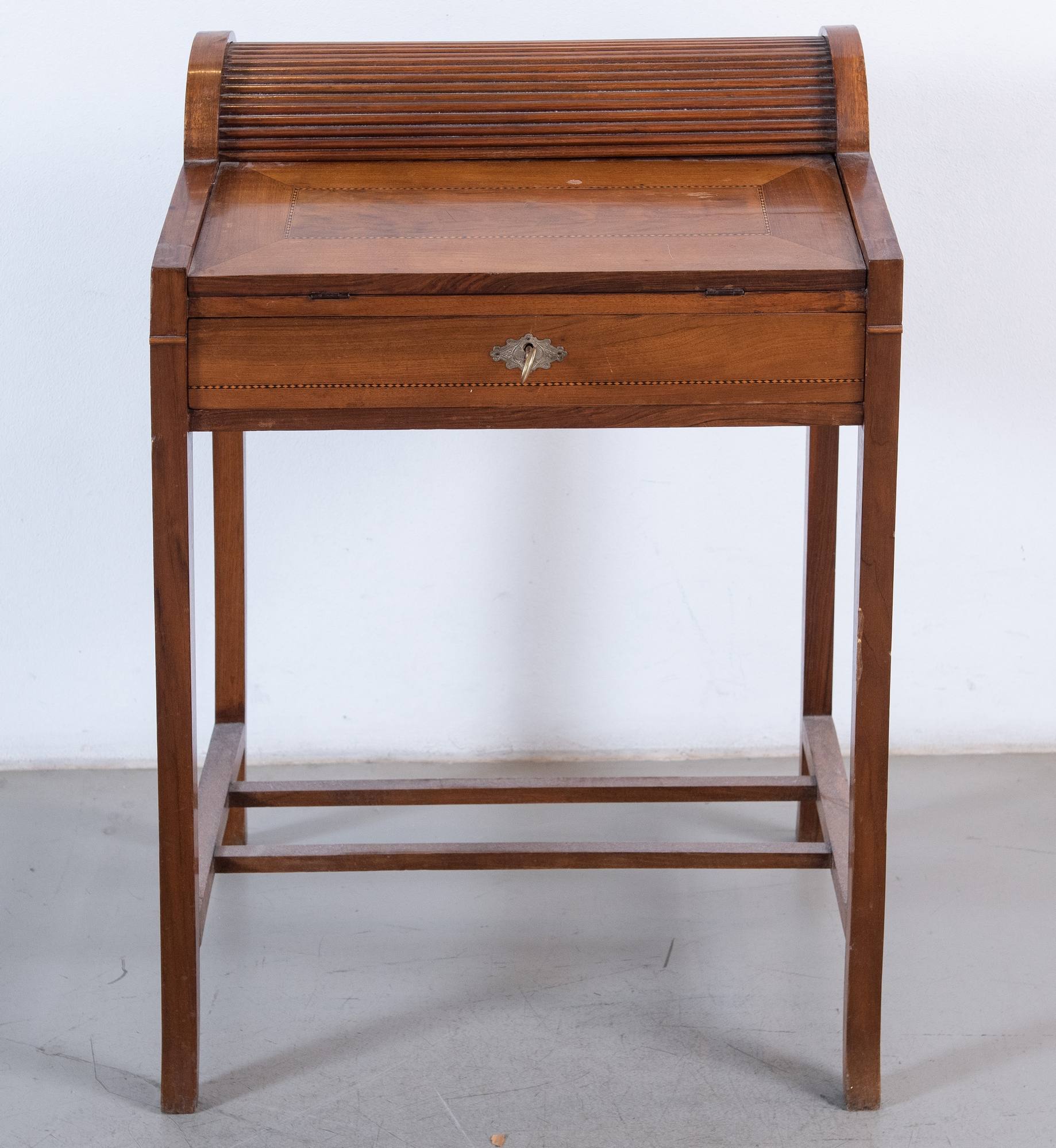 Piccolo scrittoio con apertura scorrevole e piano a ribalta. In noce con filettature a motivi geometrici. Inizi del XX secolo. Cm 87x60x42. Lievi difetti.