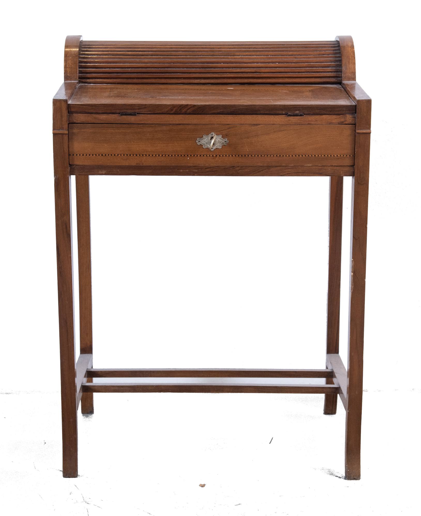 Piccolo scrittoio con apertura scorrevole e piano a ribalta. In noce con...