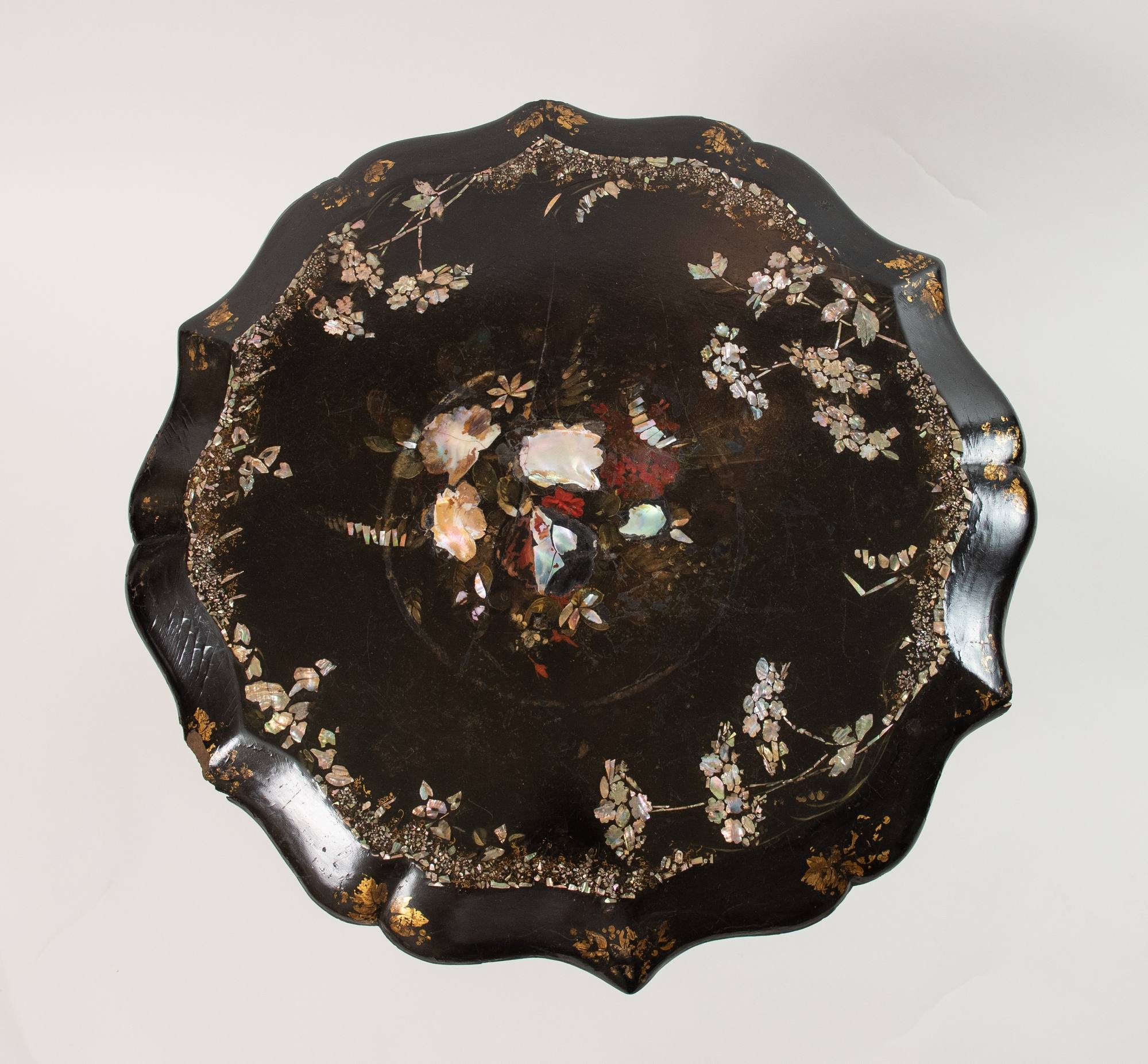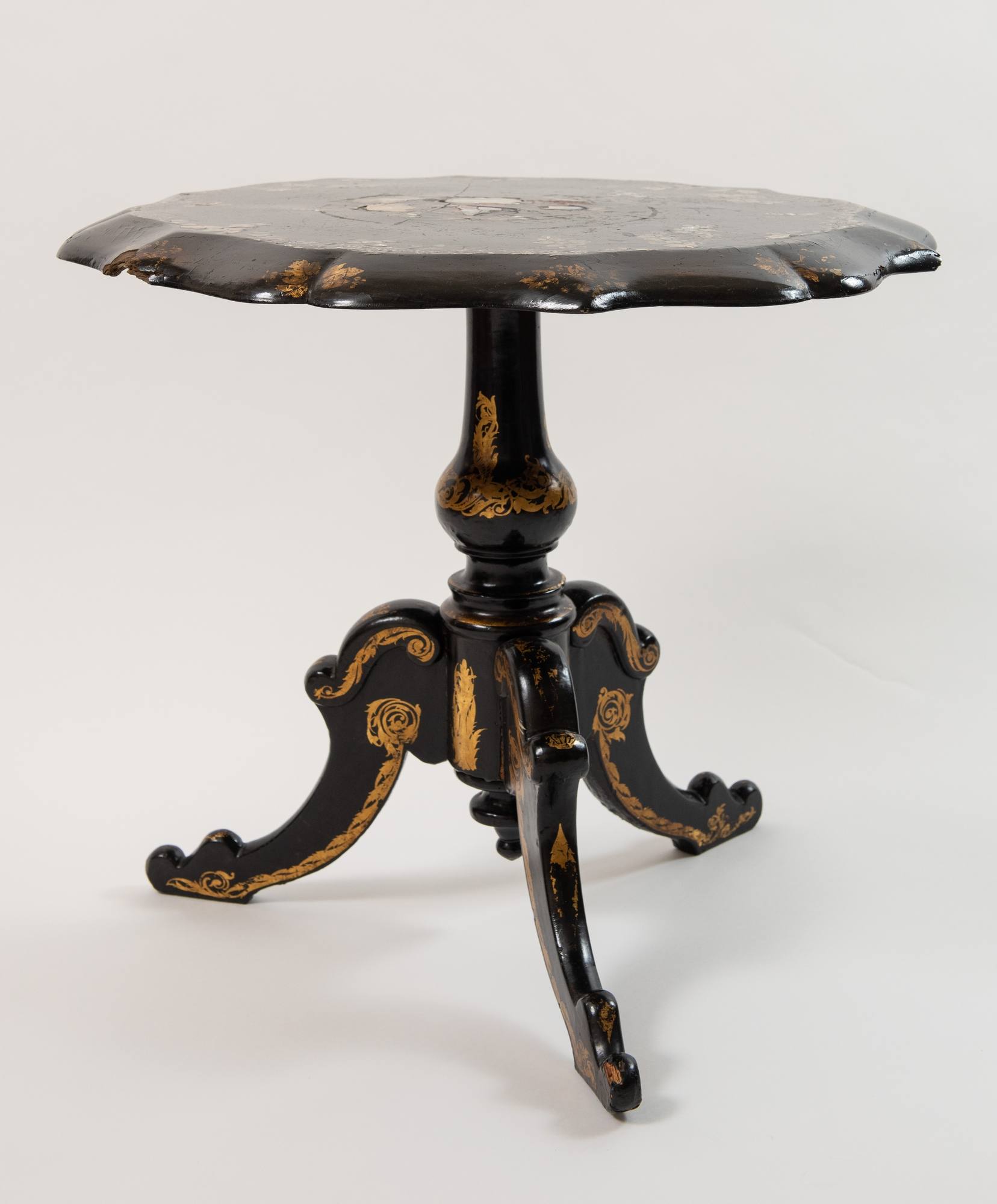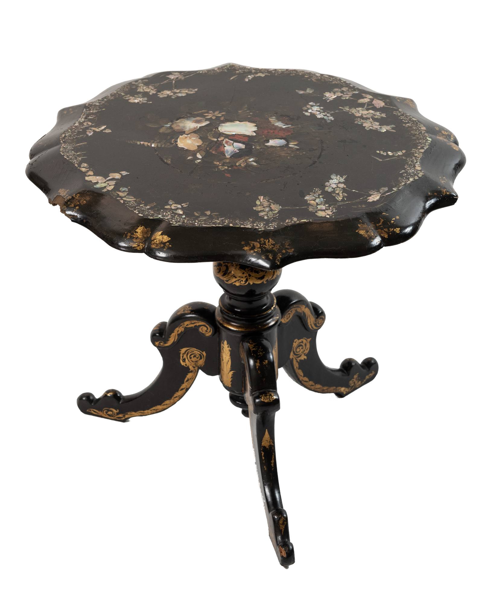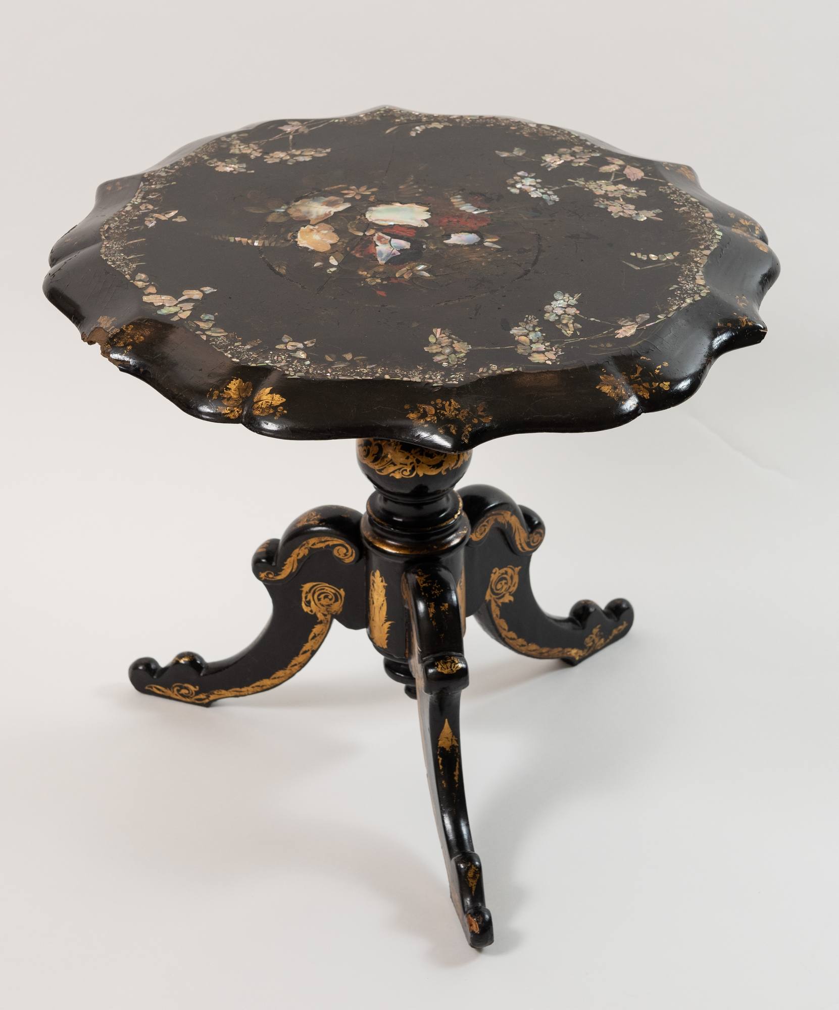 Lotto 304 | Tavolino in legno, papier-mâché, con intarsi in madreperla e doratura....