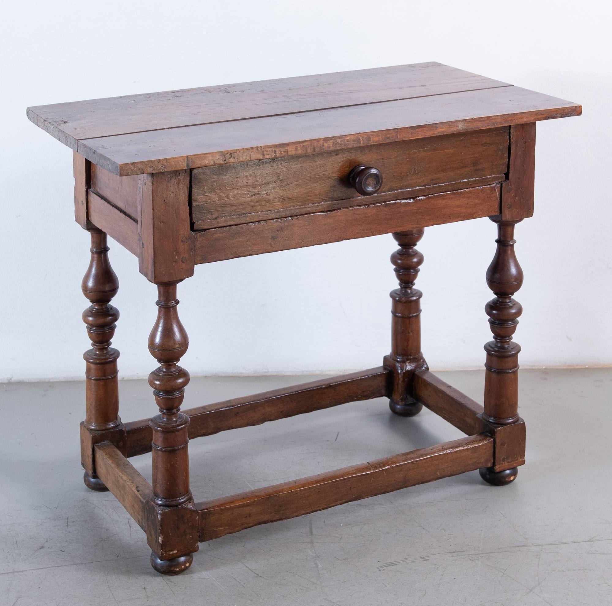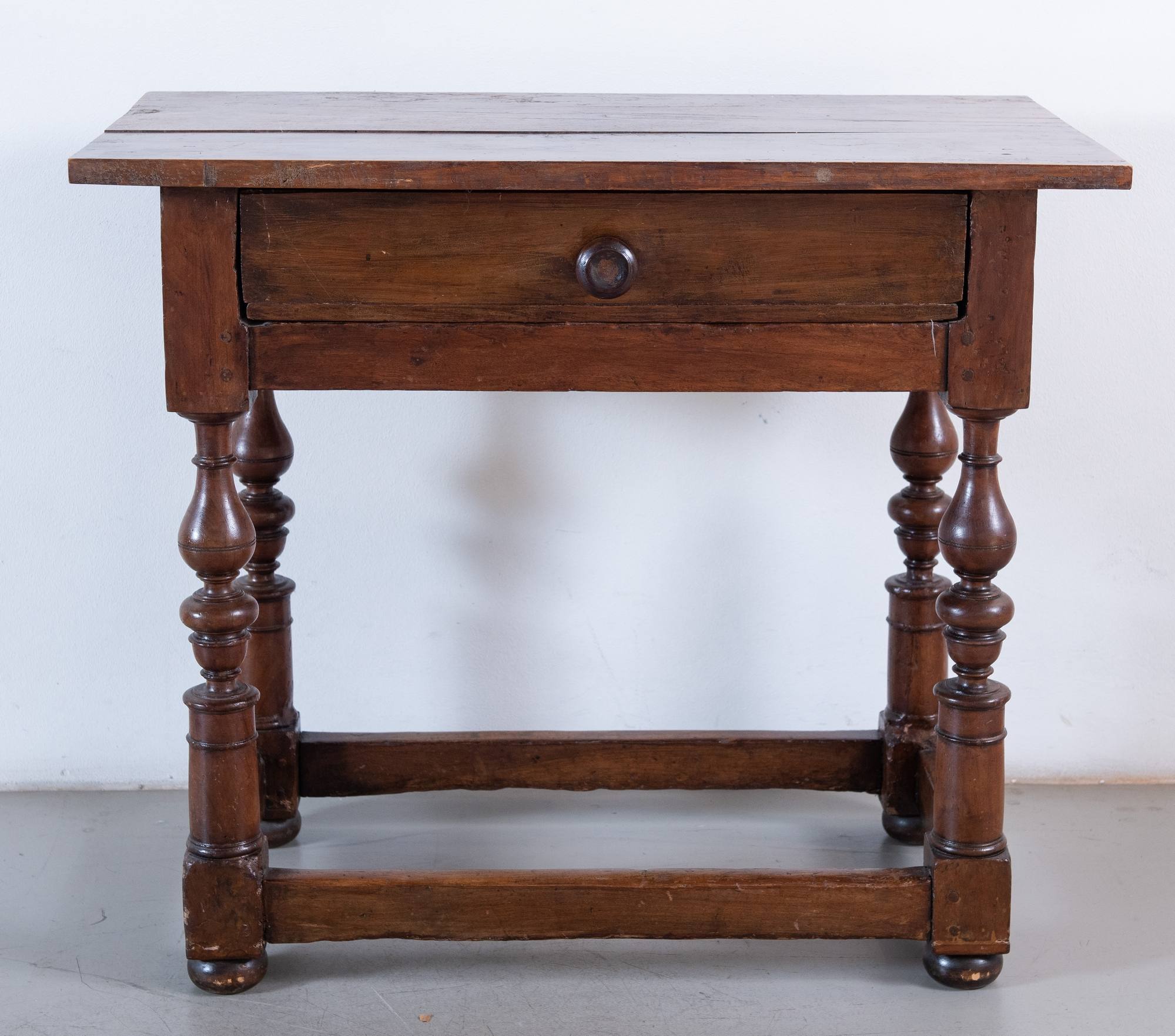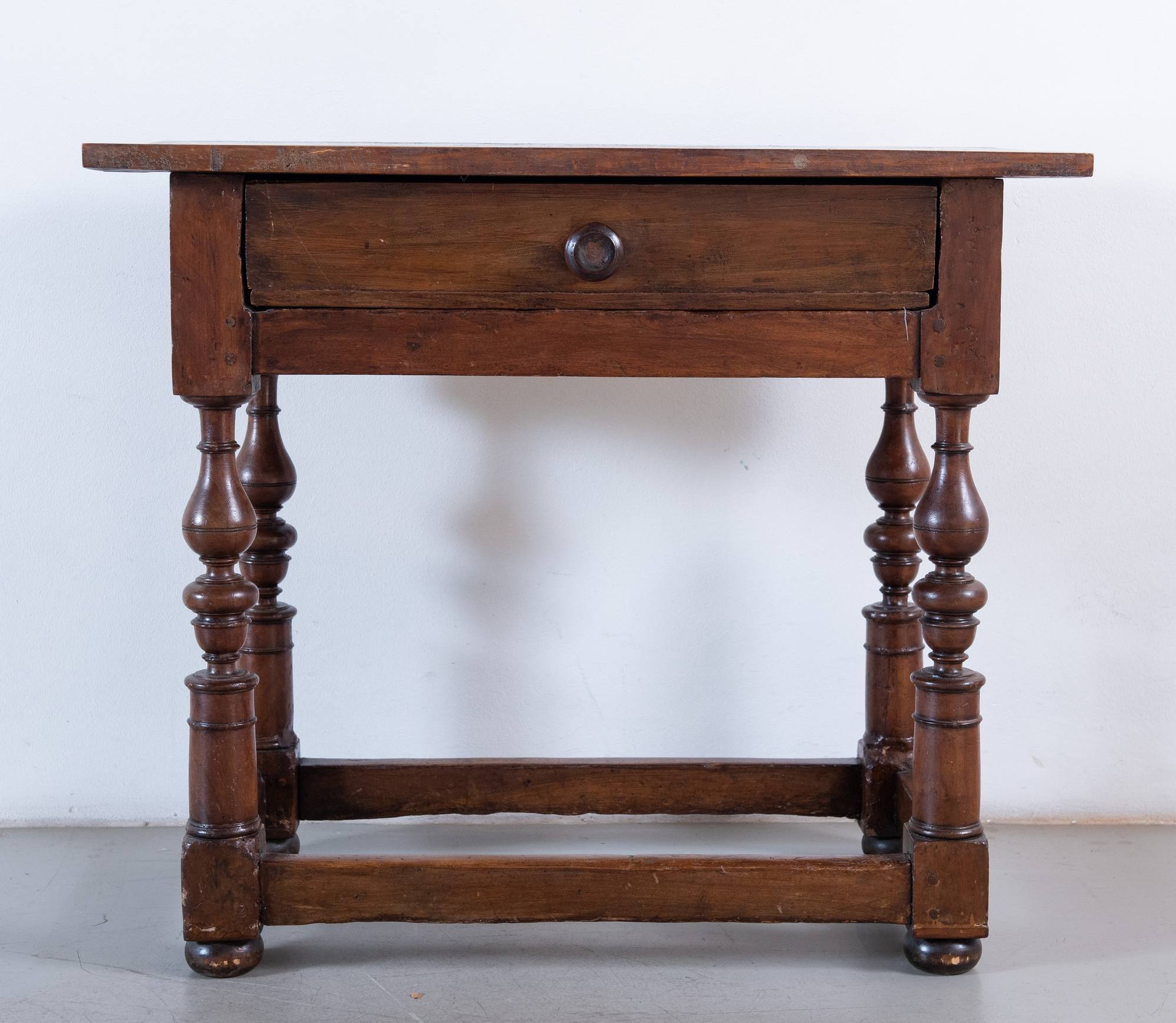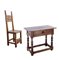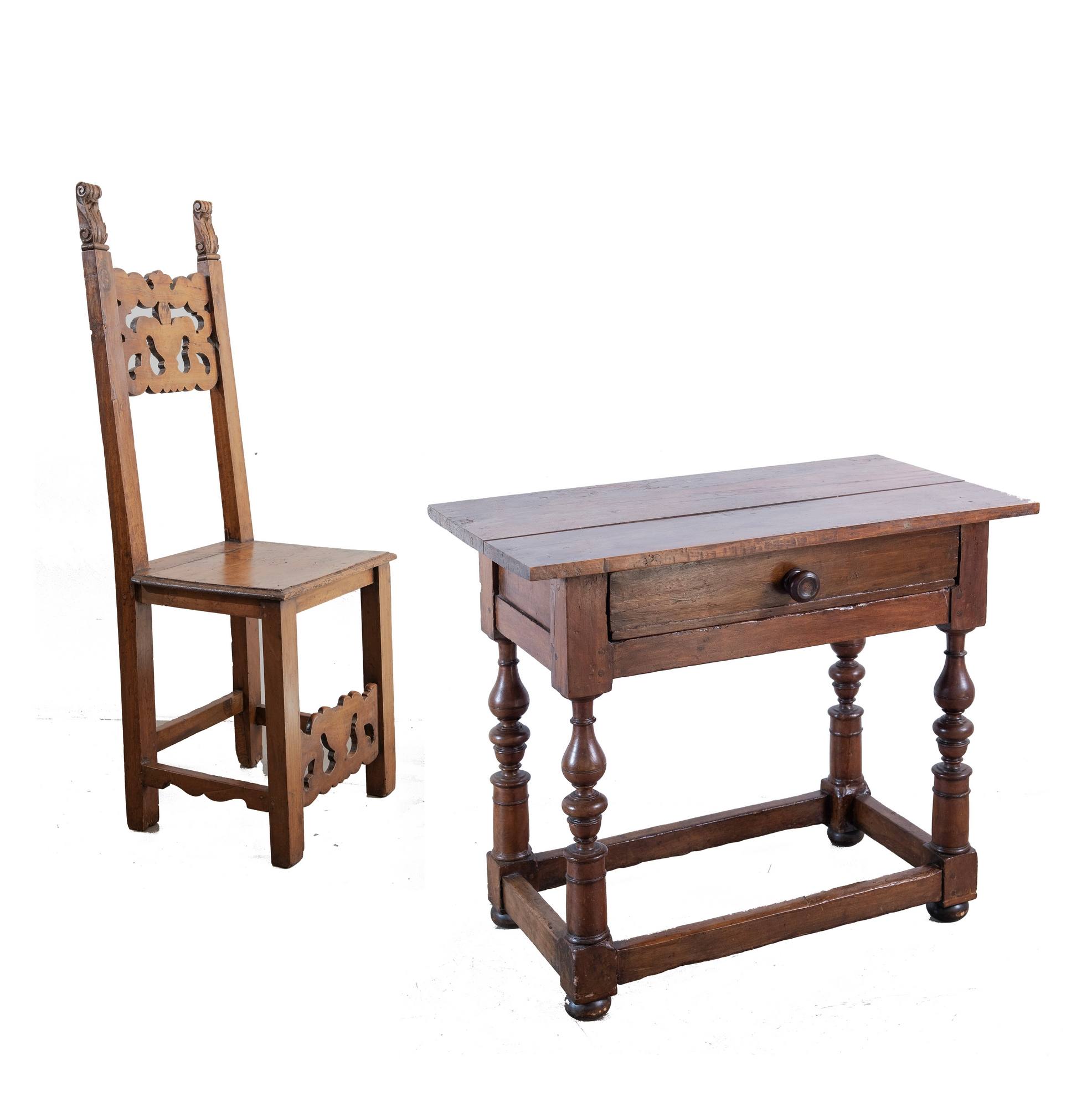 Lotto composto da tavolino e sedia. Tavolino in massello di noce. Bologna, metà del XVII secolo. Sostegno a balaustro tornito con legati da traverse alla base e fasce con cassetto sul fronte. Piano aggettante, non coevo. Sedia in massello di noce. Emilia, XVII secolo. Tavolino: cm 83x95,5x53; sedia: cm 126x48,5x39,5. Lievi difetti.