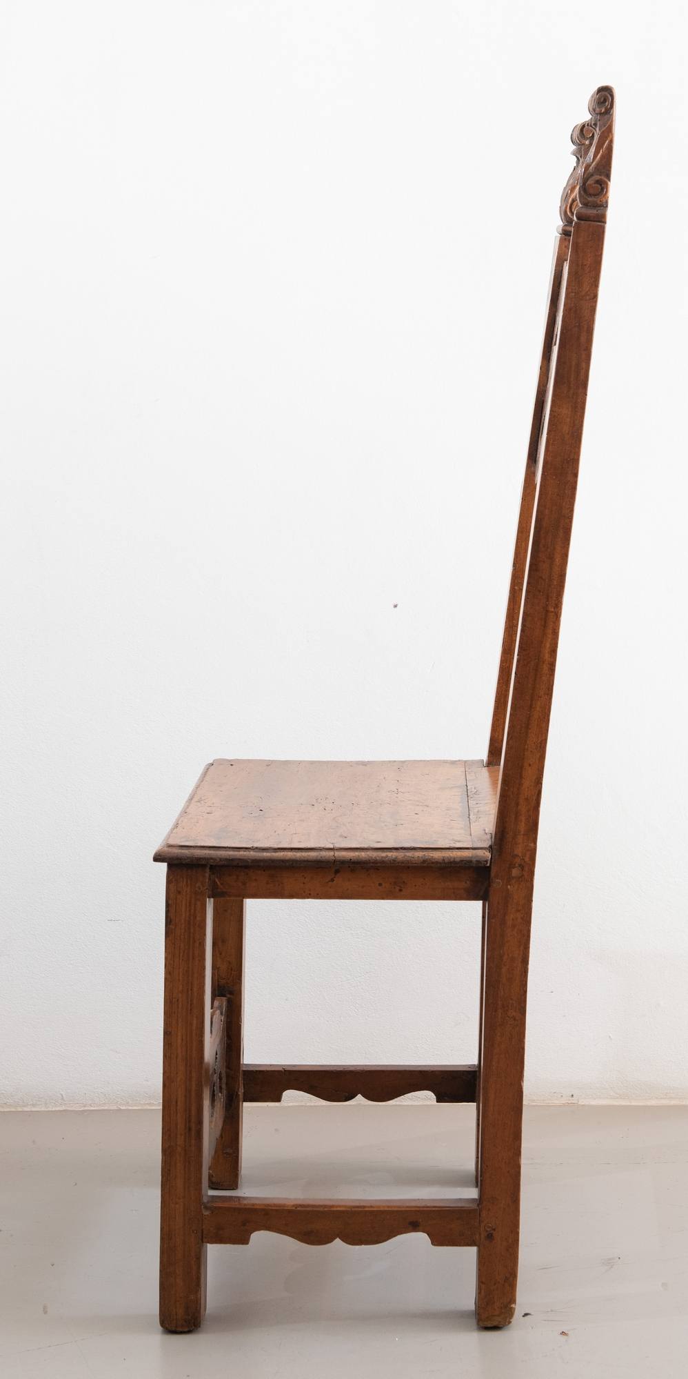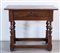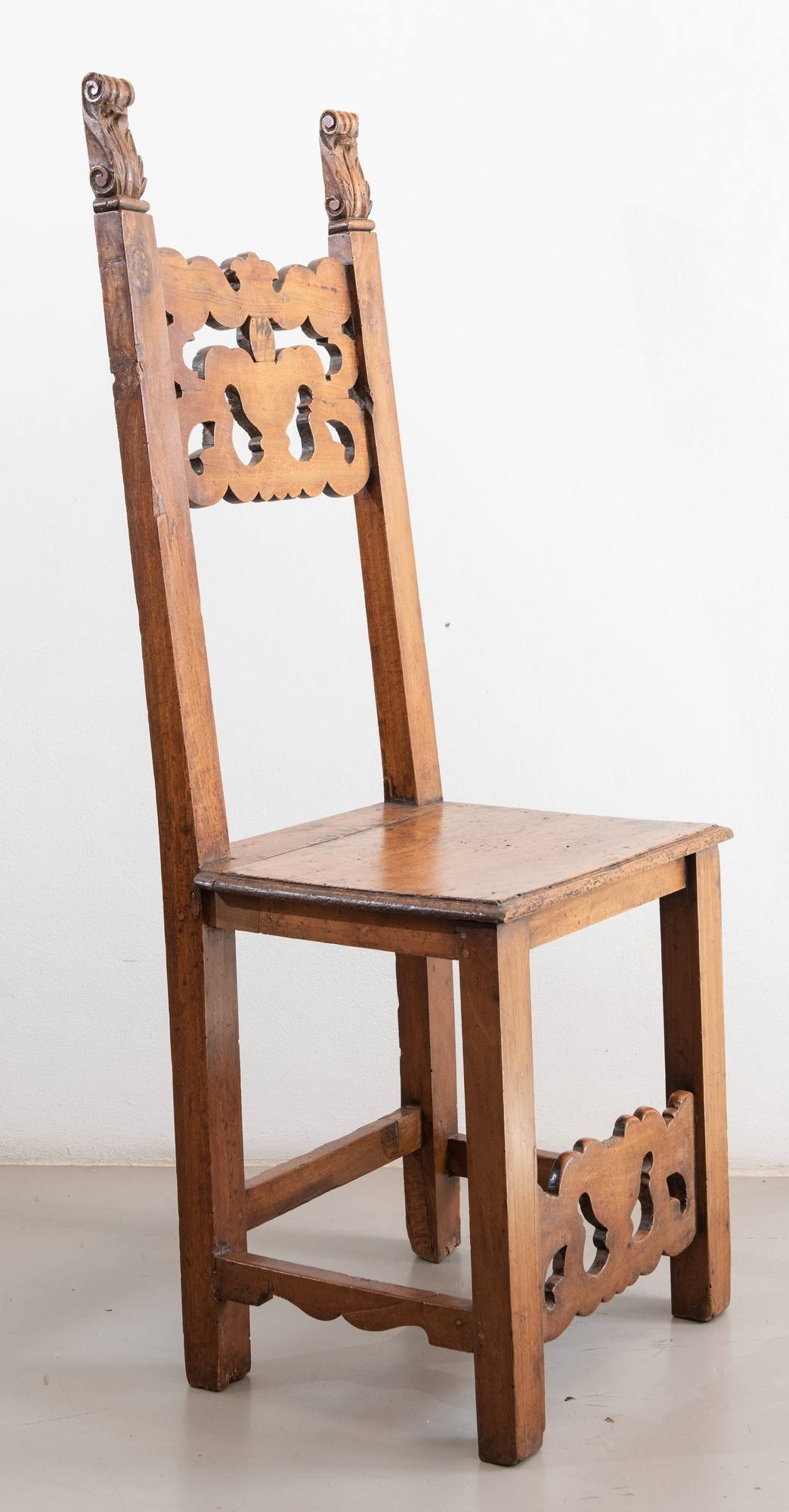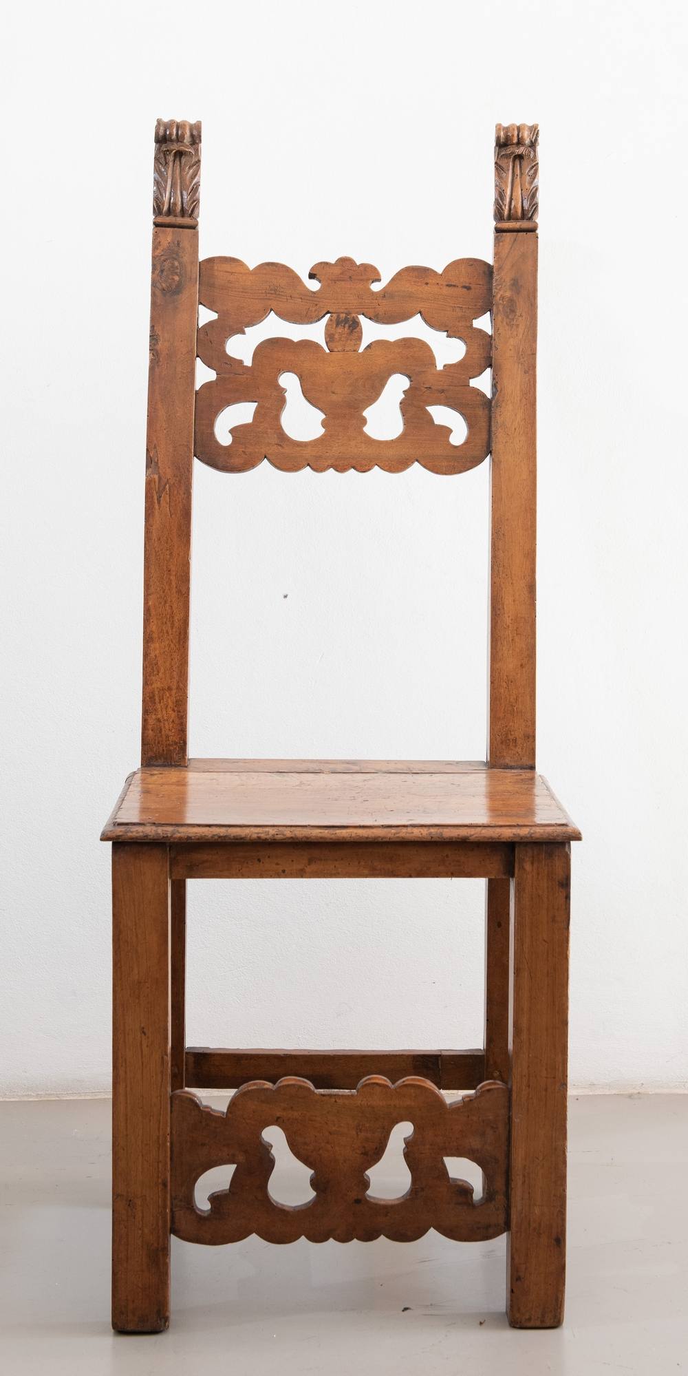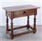 Lotto composto da tavolino e sedia. Tavolino in massello di noce. Bologna, metà del XVII secolo. Sostegno a balaustro tornito con legati da traverse alla base e fasce con cassetto sul fronte. Piano aggettante, non coevo. Sedia in massello di noce. Emilia, XVII secolo. Tavolino: cm 83x95,5x53; sedia: cm 126x48,5x39,5. Lievi difetti.
