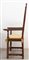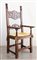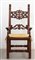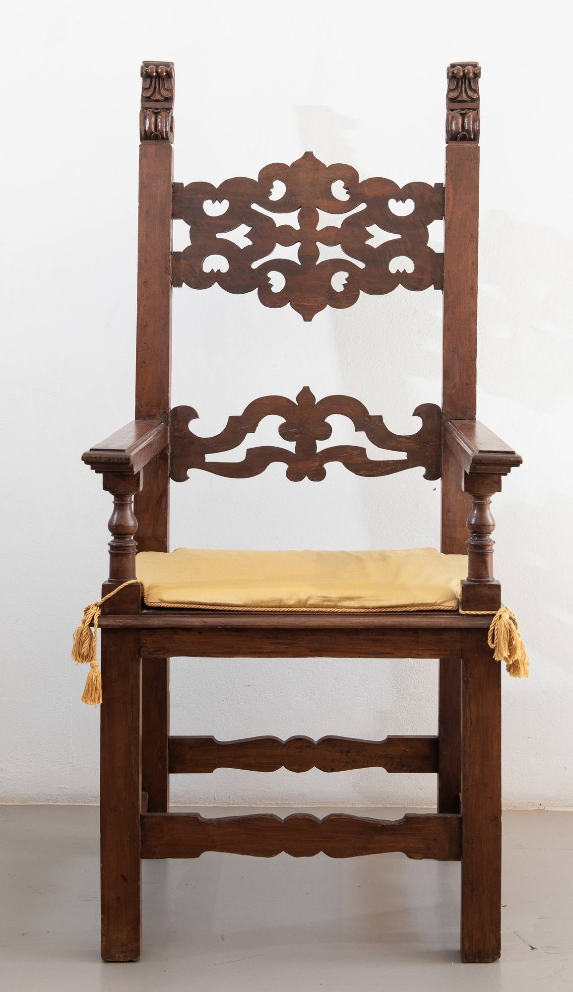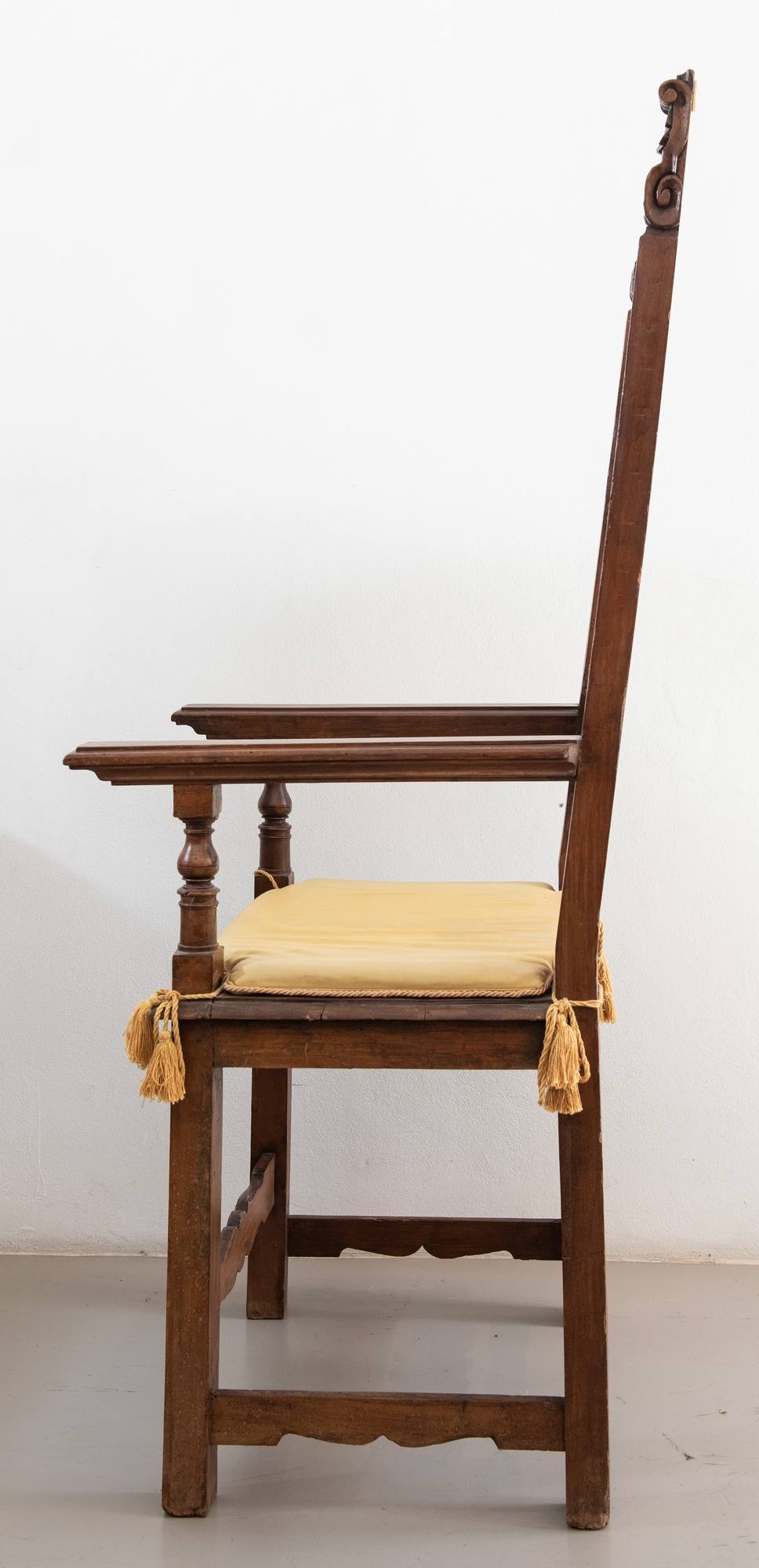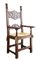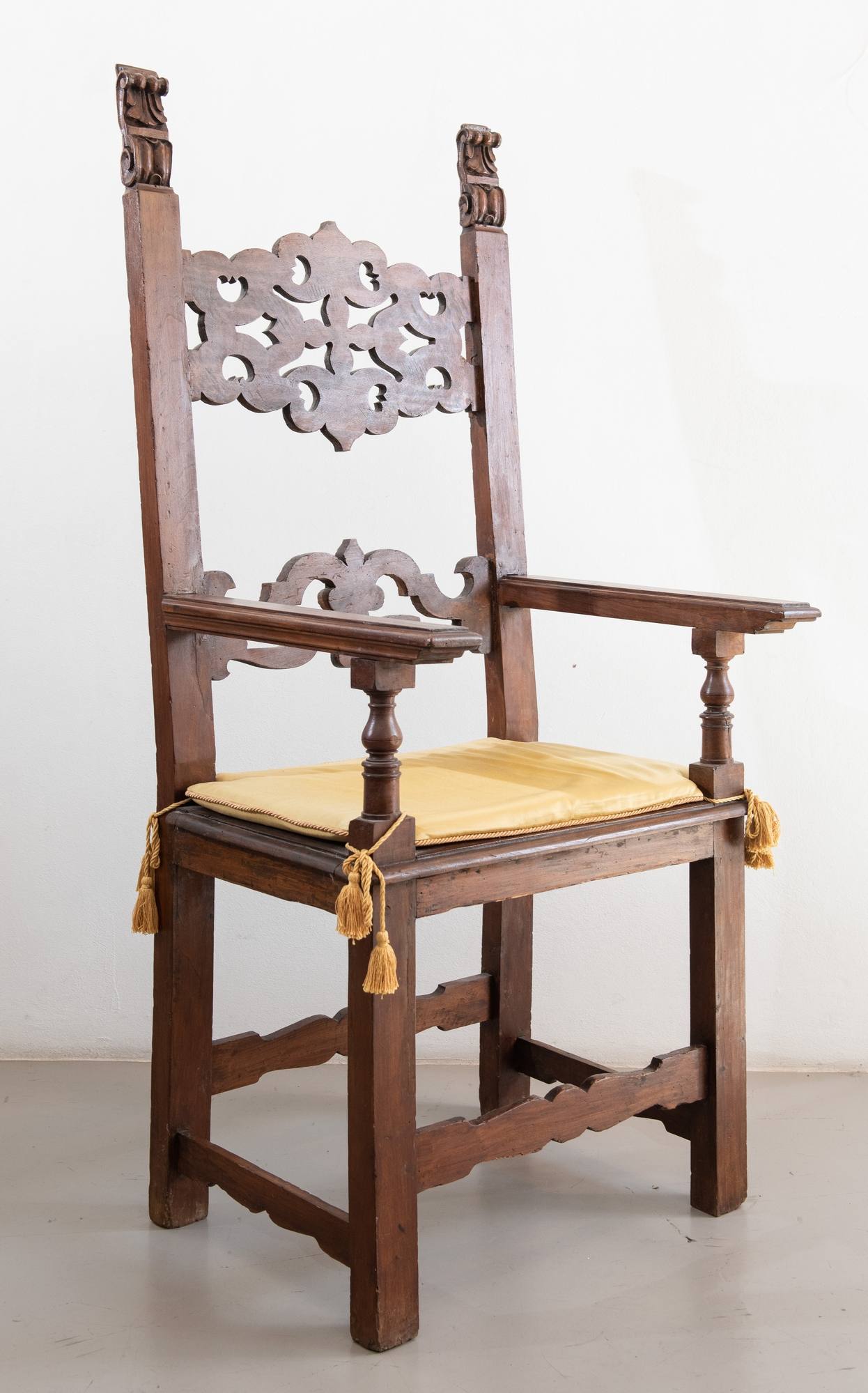 Seggiolone realizzato in massello di noce. Prima metà del XVII secolo. Con sostegni dei braccioli a blaustra, cartelle dello schienale traforate e fiamme alla sommità di esso. Cm 150x66x59. Difetti.