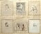 Anonimo del XIX sec. Quattro caricature e due studi per composizioni China; China e acquerello, cm. 12x10 (le quattro caricature); cm. 8x11(i due studi) Sei opere incorniciate in un'unica composizione, quattro fogli sono siglati: "A.V."