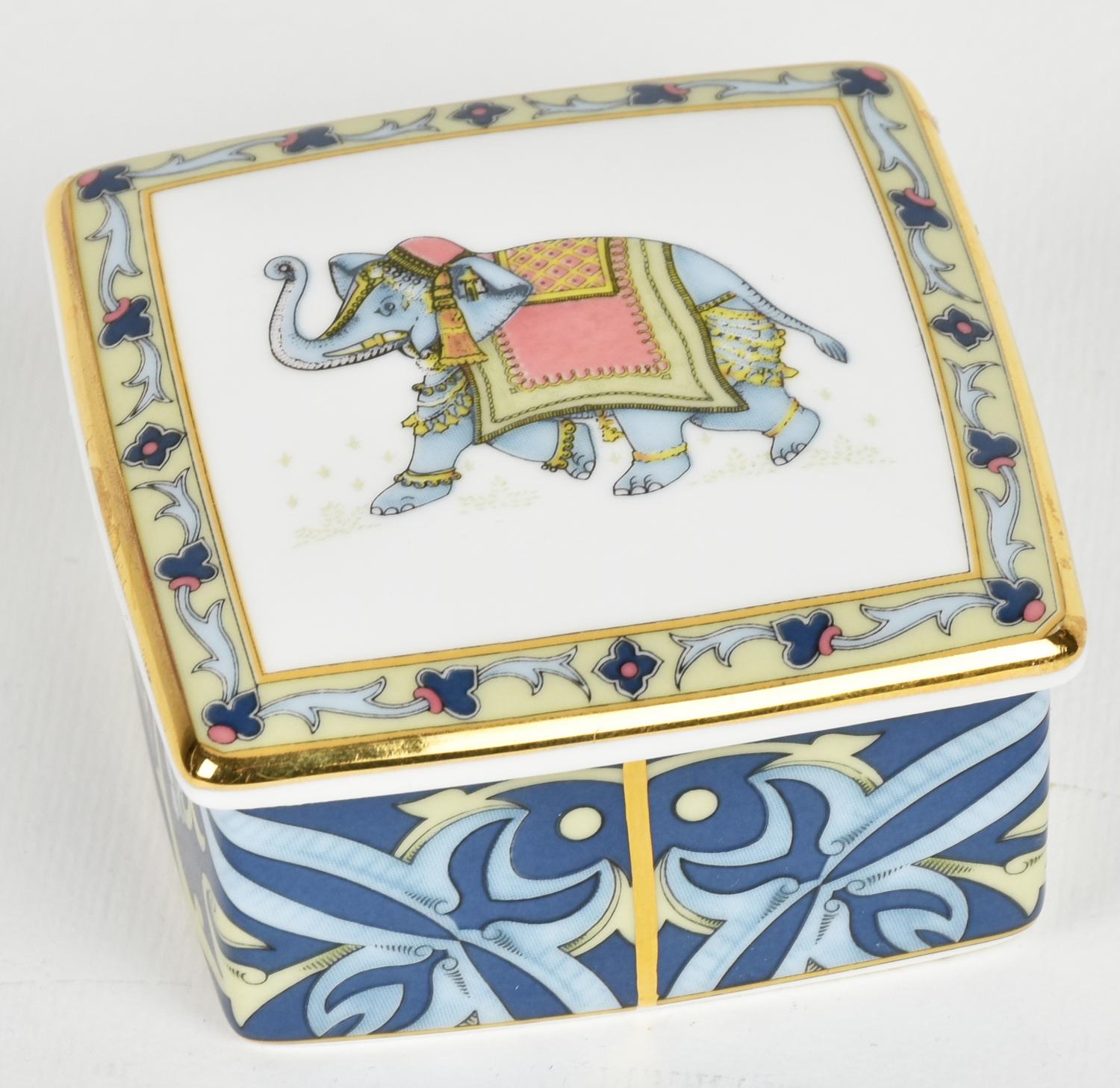 manifattura Wedgwood, in porcellana decorata a motivi geometrici ed elefante sul coperchio, 'Bone China'