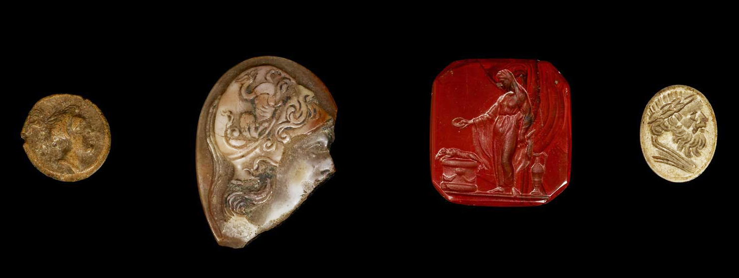 Castone quadrangolare inciso con una figura femminile state a sinistra velata tiene una patera su altare cilindrico con animale al di sopra e dietro una brocca; castone ellittico inciso con testa di Minerva con elmo volta a destra; sullelmo un ippocampo; castone ellittico inciso con testa maschile barbata e laureata a destra; castone ellittico inciso con testa femminile volta a destra con capelli raccolti sulla nuca (4)
