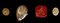 Castone quadrangolare inciso con una figura femminile state a sinistra velata tiene una patera su altare cilindrico con animale al di sopra e dietro una brocca; castone ellittico inciso con testa di Minerva con elmo volta a destra; sullelmo un ippocampo; castone ellittico inciso con testa maschile barbata e laureata a destra; castone ellittico inciso con testa femminile volta a destra con capelli raccolti sulla nuca (4)