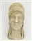 Testa femminile in stile greco ionico arcaico di giovane donna con orecchini circolari e trecce che scendono sulle spalle