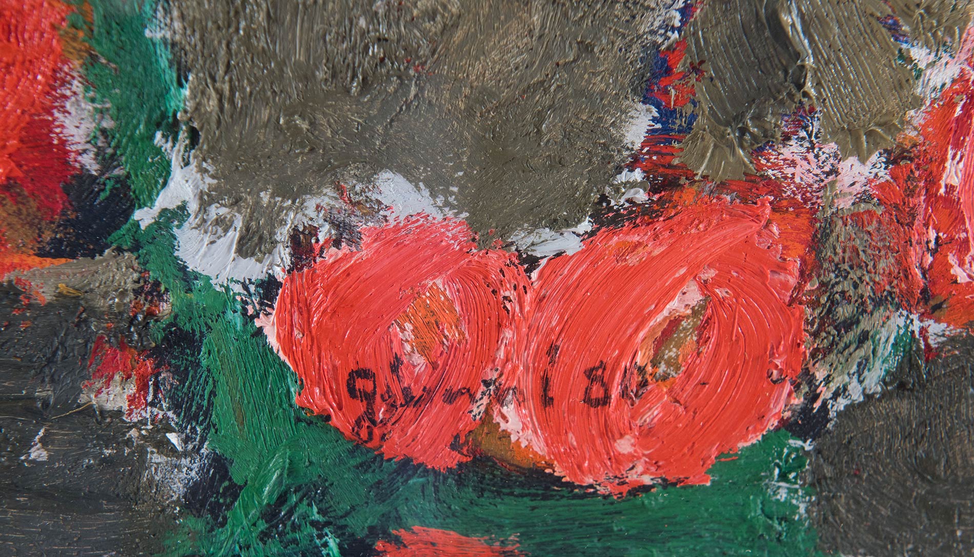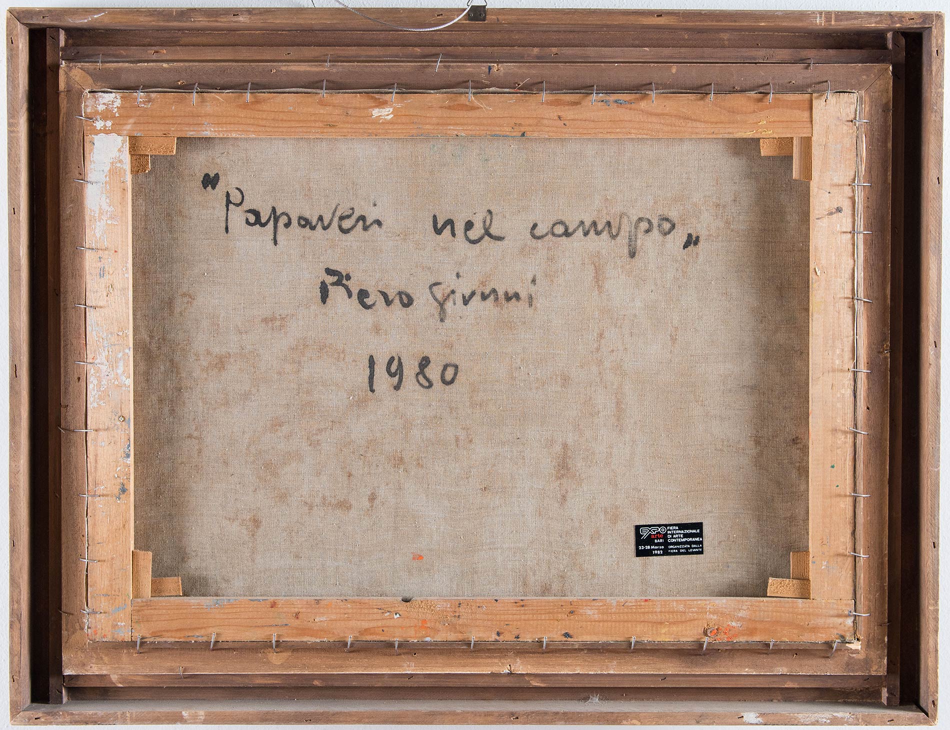 Piero Giunni (Villa Cortese 1912 – Bondone 2000), “Papaveri nel campo”, 1980. Olio su tela, firmato e datato in basso a sinistra Giunni 80, al retro titolo, firma e data ‘Papaveri nel camp/Piero Giunni/1980’. H cm 50x70 Al retro reca etichetta ‘ExpoArte Bari – Fiera Internazionale di Arte Contemporanea’.