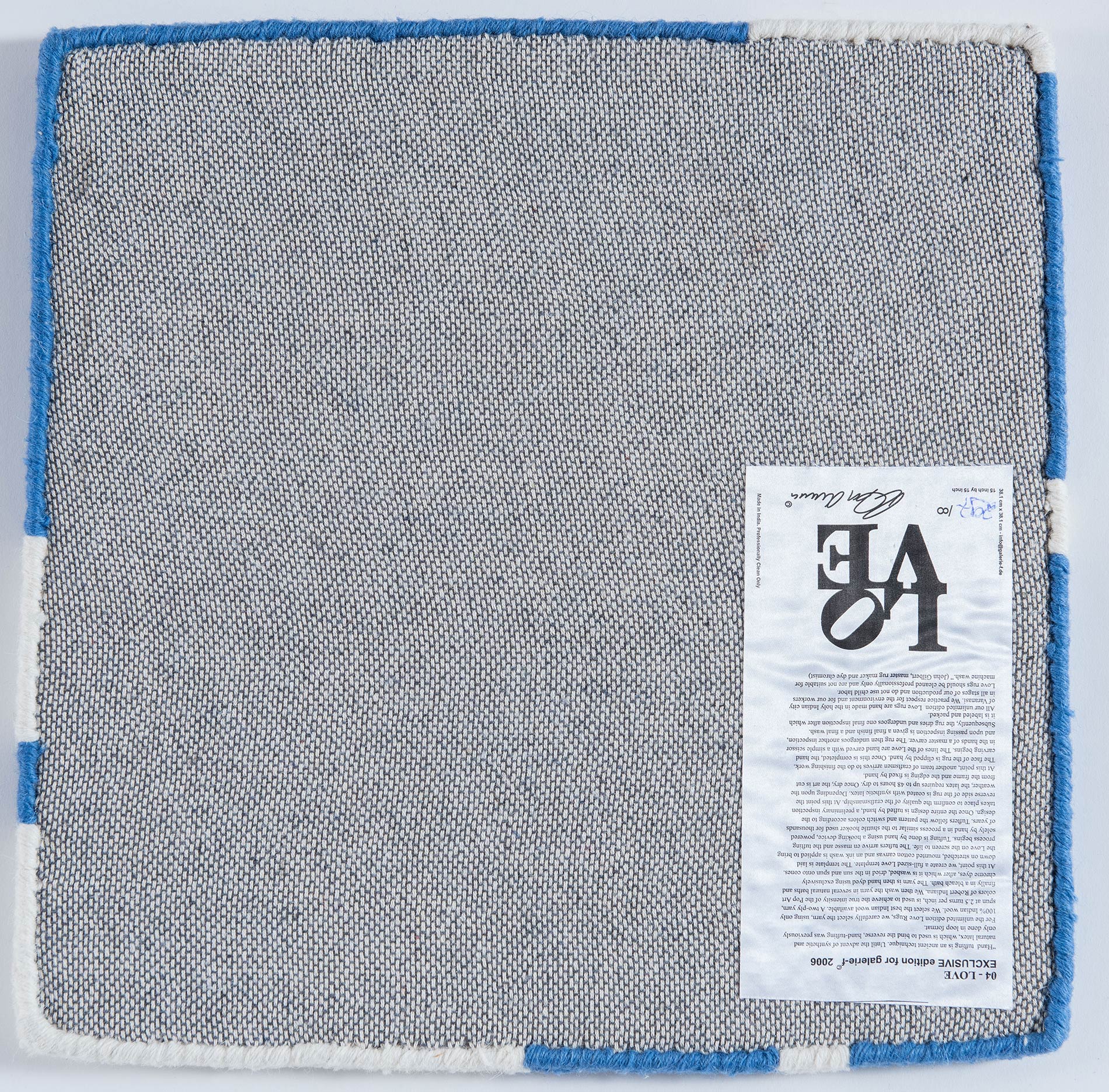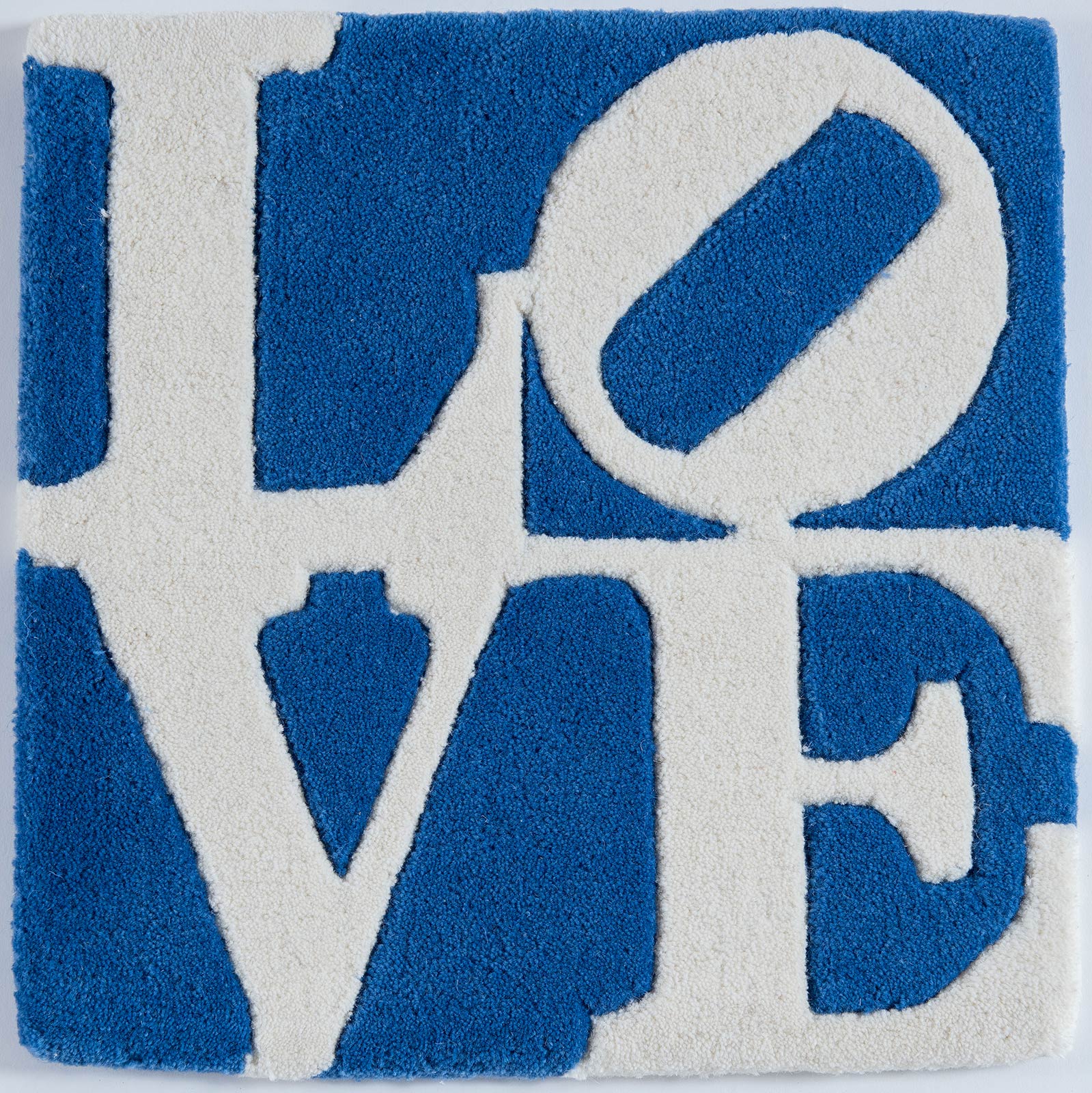 Robert Indiana (New Castle 1928 – Vinalhaven 2018), “Love”. Tappeto tessuto a mano con lana indiana al 100%, filato a 2.5 giri per pollice, H cm 38.1x38.1 Copyright dell'artista sull'etichetta allegata sul retro. Edizione aperta per Galerie-f, realizzata sotto la supervisione di John Gilbert, maestro produttore di tappeti.
