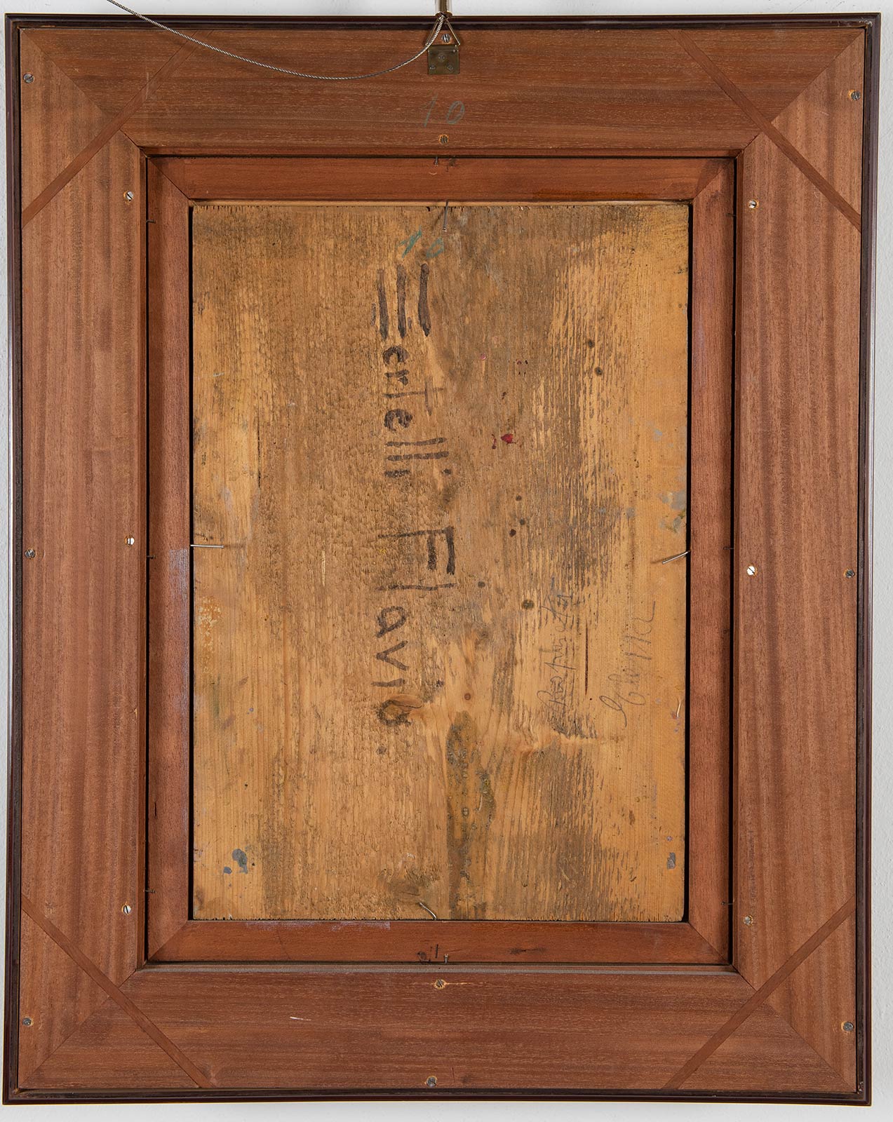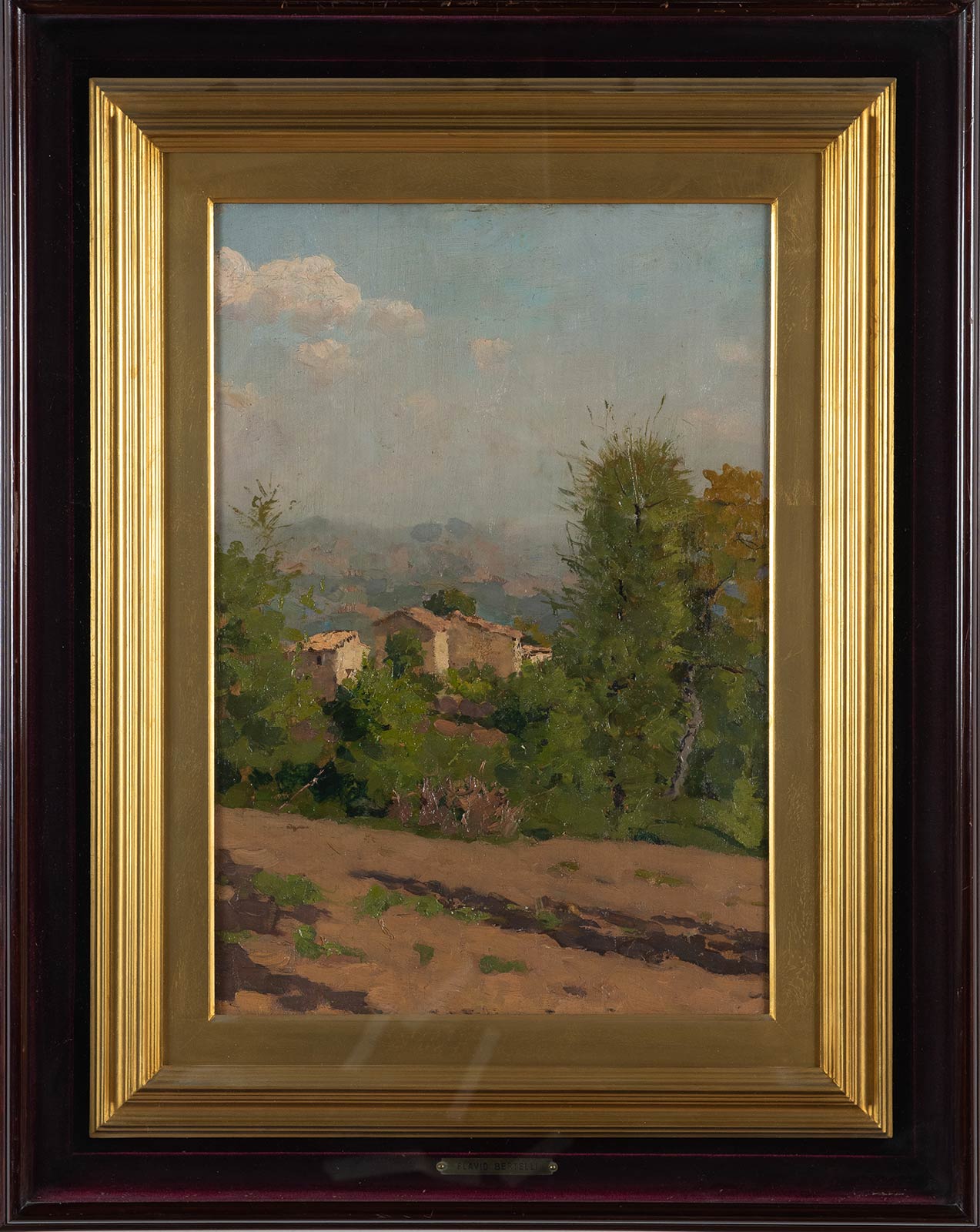 Flavio Bertelli (San Lazzaro di Savena 1865 – Rimini 1941), “Borgo”. Olio su tavola, firmato al retro Bertelli Flavio, iscrizioni a matita al retro, H cm 47x32