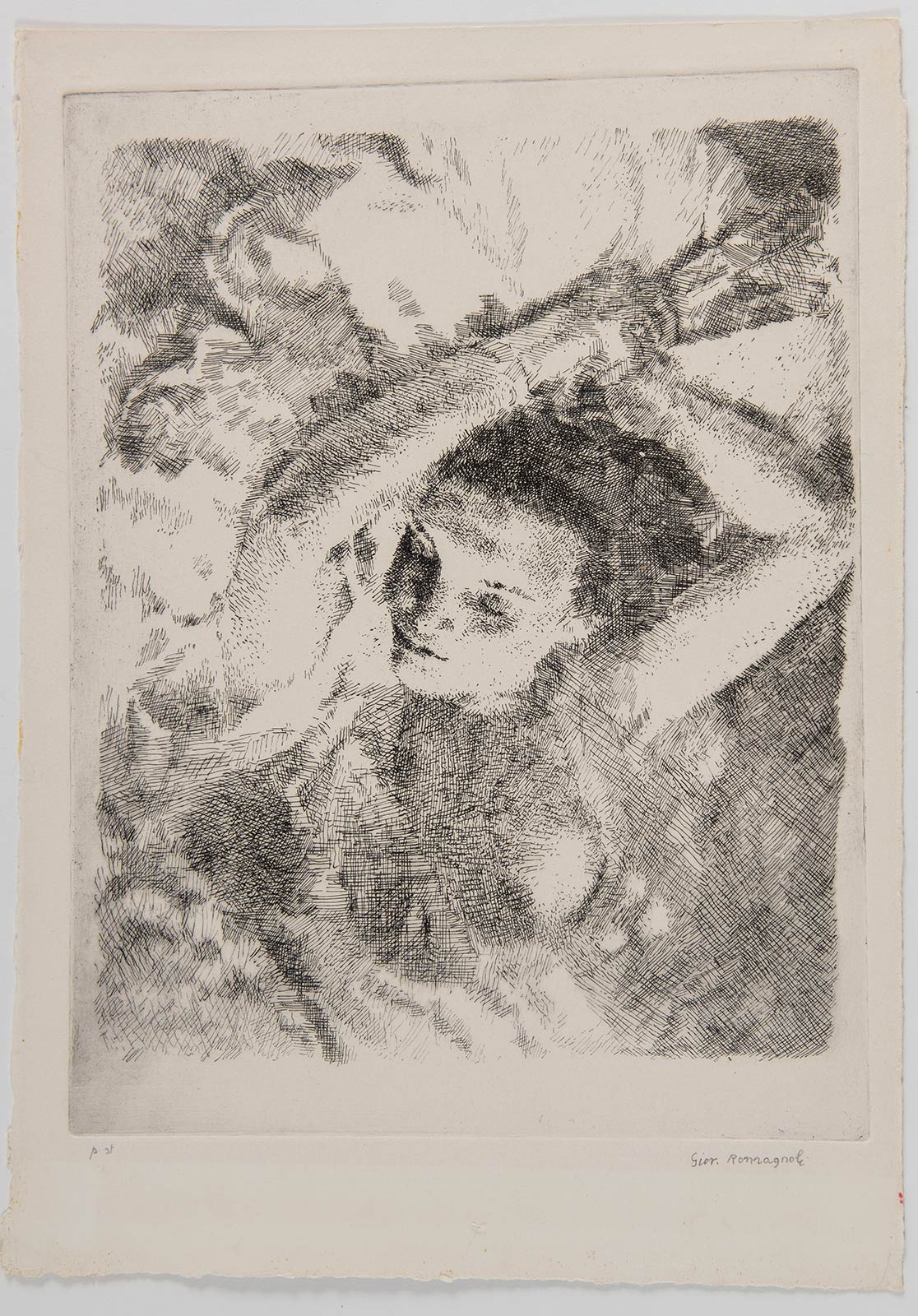 Giovanni Romagnoli (Faenza 1893 – Bologna 1976), “Nudo femminile”. Acquaforte su carta, firmata in basso a destra Giov. Romagnoli, esemplare p.ar., Lastra H cm 41.5x32 – Foglio H cm 50x35.5