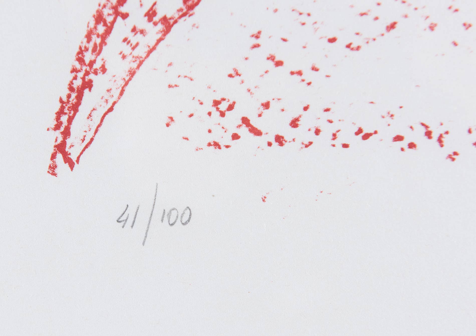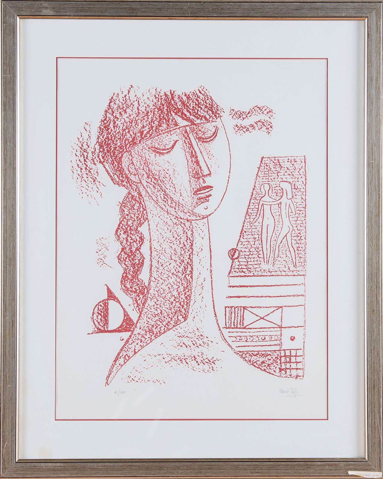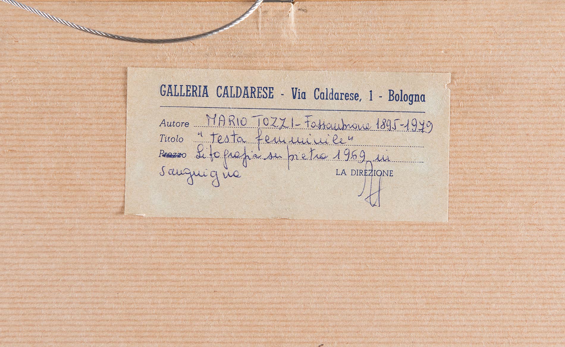 Mario Tozzi (Fossombrone 1895 – Saint-Jean-du-Gard 1979), “Testa femminile”, 1969. Litografia su pietra in sanguigna, firmata in basso a destra Mario Tozzi, numero di tiratura in basso a sinistra 41/100, timbro a secco in basso a sinistra, H cm 58.5x44 Al retro reca etichetta Galleria Caldarese – Bologna.