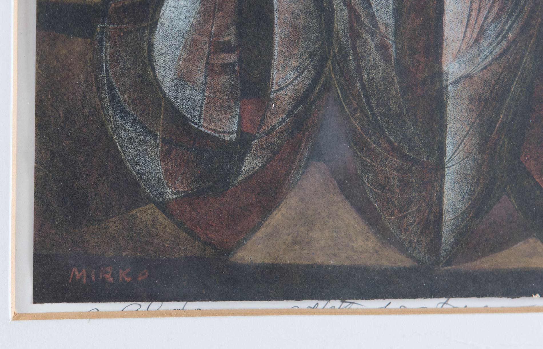Mirko Basaldella (Udine 1910 – Cambridge 1969), “Strumenti musicali”. Tecnica mista su carta, firmata in basso a sinistra Mirko, H cm 30x23.5 Al retro reca iscrizione a penna ‘N° M.6/del Catalogo Generale dell’opera di Mirko’. Provenienza: Collezione Aldo Merlo – Udine. Aldo Merlo nacque a Pontebba (Udine) il 26 maggio 1911. Negli anni Sessanta si trasferì a Roma dove si accostò alla pittura da autodidatta, frequentando gli ambienti artistici udinesi della Scuola friulana d’avanguardia fondata da Modotto nel 1928, di cui facevano parte i fratelli Basaldella, Filipponi, Grassi, Pittino, Max Piccini. Strinse un saldo rapporto d’amicizia con Afro Basaldella col quale fu allievo della Scuola Ufficiali a Spoleto dove incontrò il pittore Corrado Cagli. Rientrarono quindi a Udine al 2° Fanteria: due caricature suggellano questo momento della loro comune vita militare, un ritratto di M. e un autoritratto dipinti da Afro sulle ante di un armadio (collezione privata). Da militare partecipò alla campagna d’Etiopia, fu in Tripolitania e nel secondo conflitto mondiale in Croazia, guadagnandosi una medaglia di bronzo al valore. Rientrato a Udine, nel dopoguerra frequentò Zigaina e gli altri artisti del gruppo neorealista di Vicolo Florio. M. posò come modello per Afro nel dipinto Pastore presentato alla Biennale di Venezia del 1936, anno in cui Basaldella firmò anche il Ritratto di Aldo Merlo, esposto alla personale presso la Galleria della Cometa di Roma e riprodotto sulla copertina del catalogo. Nel 1972, per iniziativa di Aldo Merlo in collaborazione con Mario Graziani e Isabella Reale, direttrice della Galleria d’Arte Moderna di Udine, si è proceduto alla redazione del ‘Catalogo Generale Ragionato dei Disegni di Afro’, uscito nel 2006. Fonte: Dizionario Bibliografico dei Friulani.