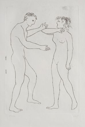 Enrico Baj (Milano, 1924 - 2003) La coppia, 1952-53 Acquaforte, mm. 300x210 (foglio); mm. 225x150 (lastra); P.A Firma in basso a destra, tiratura in basso a destra. Tratta dal libro "De Rerum Natura" Schwarz Editore, Milano, 1958 Esemplare di prova a parte della tiratura di 51 esemplari. Bibliografia: Baj, Catalogo Generale delle Stampe Originali, Electa Milano 1986, n° 16 pag. 52