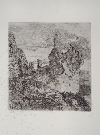 Giovanni Fattori (Livorno, 1825 - Firenze, 1908) Rovine del Castello di Vincigliata Acquaforte, mm. 354x507 (foglio); mm.219x234 (lastra) Firma in lastra in basso a sinistra; timbro a secco del Cinquantenario in basso a destra.