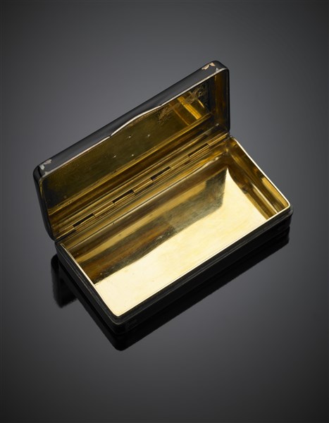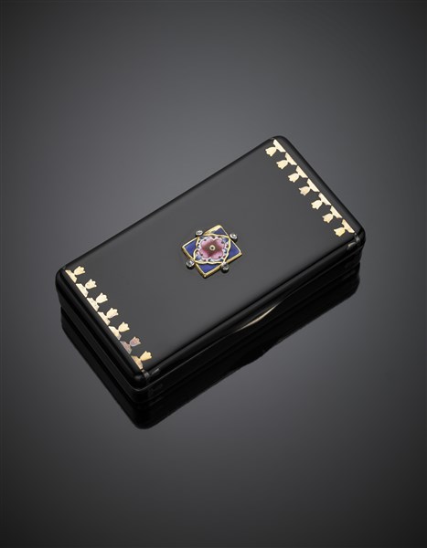 Scatola in lega di oro e argento, smalti e piccoli diamanti. N° S658, g 86,80 circa, lungh. cm 7,50 circa. Firmato Cartier made in France, marchi francesi e marcato D8CT, 661. In scatola originale Cartier (lievi difetti)