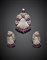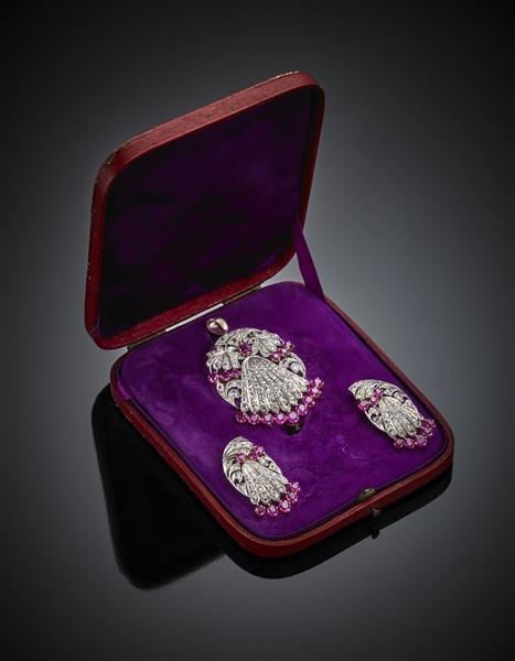 Rose cut diamond and ruby silver and gold jewellery set comprising cm 4.30 circa earrings and cm 6.70 circa pendant/brooch, rubies in all ct. 10.00 circa and diamonds in all ct. 3 circa, in all g 43.50 circa. Signed B.S & F. In original fitted case
