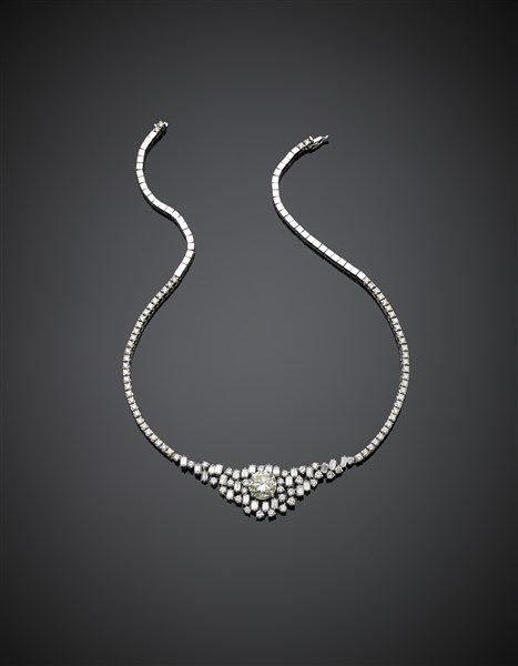 Collier in oro bianco con diamanti rotondi e a baguette per complessivi ct. 10 circa, al centro un diamante di ct. 4,24, g 40,60 circa, lungh. cm 40,50 circa.
