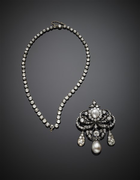 Old mine diamond silver and 18K gold necklace with volute pendant/brooch accented with natural saltwater central button pearl and pearl drop respectively mm 11.65-12.35 x 8 circa and mm 11.70-13.40 x 18.80 circa, the brooch also holds two diamond pear shape pendant in which the main cushion shape diamonds are ct. 2.40 circa and ct. 3 circa, diamonds in all ct. 40 circa, in all g 67.30 circa, length cm 37.50 circa. (losses)