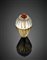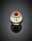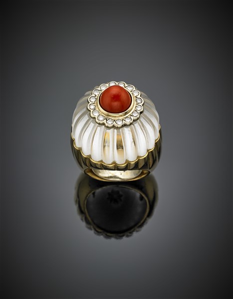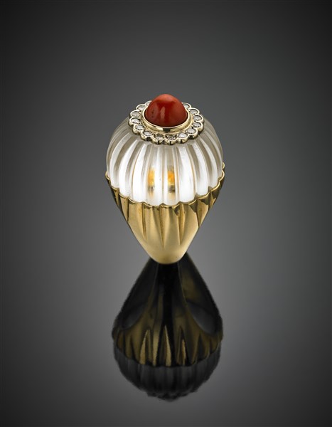 Anello in oro giallo, cristallo di rocca scolpito e diamanti su oro bianco a contornare un corallo cabochon, all'interno contranello, g 33,70 circa misura 15,50/55,50. Firmato Webb.