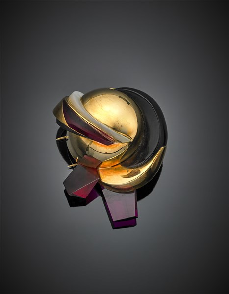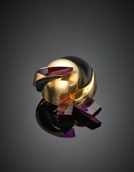 ALBERTO ZORZI "Opera aperta" Spilla in oro giallo lucido, rubini sintetici, mad