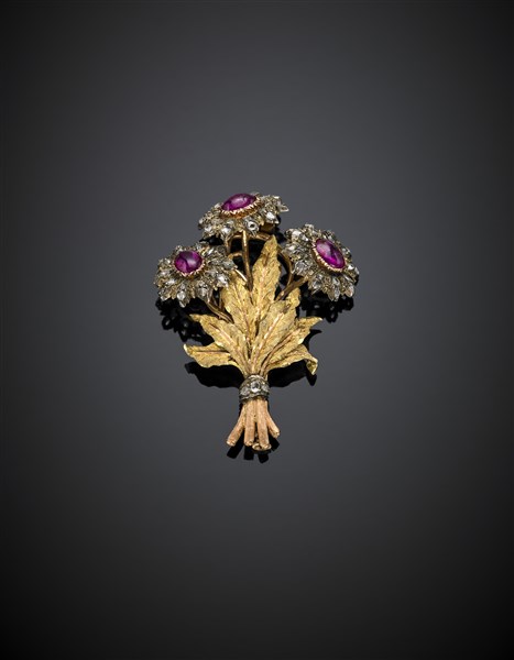 Lotto 417 | BUCCELLATI Broche floreale in oro giallo, argento rubini cabochon e diamanti a